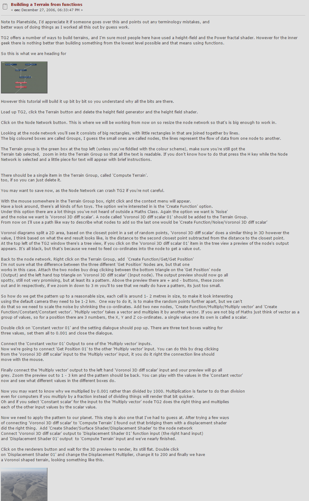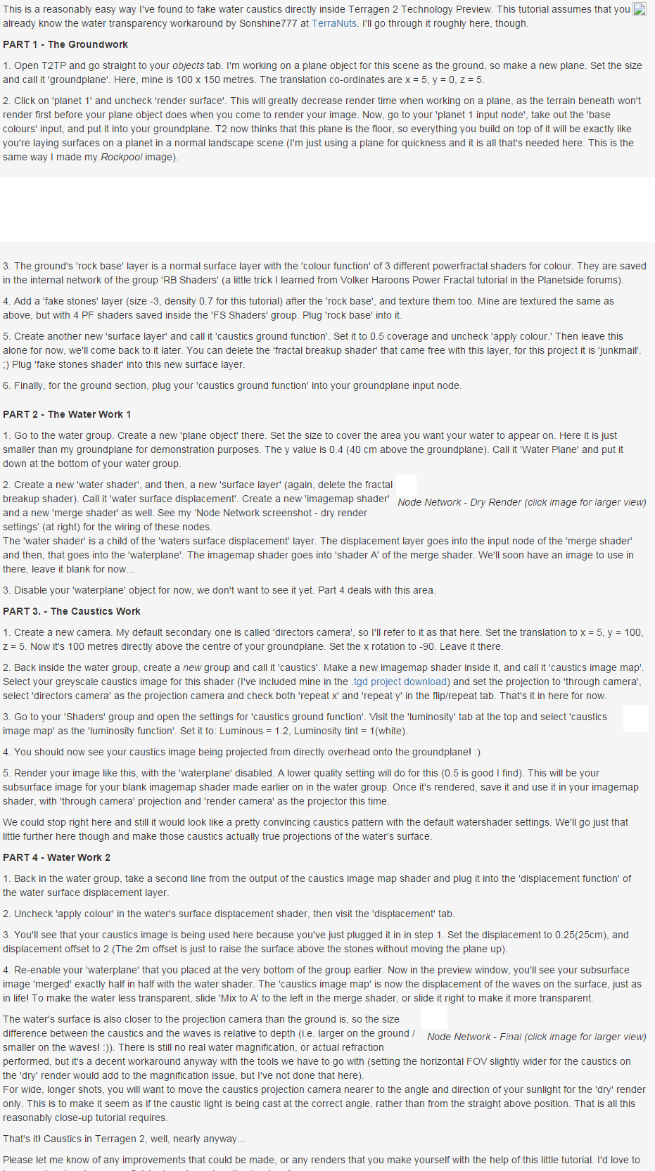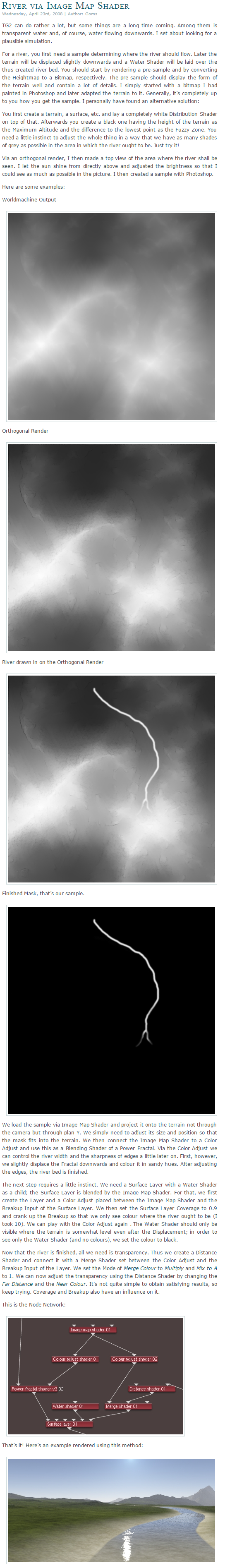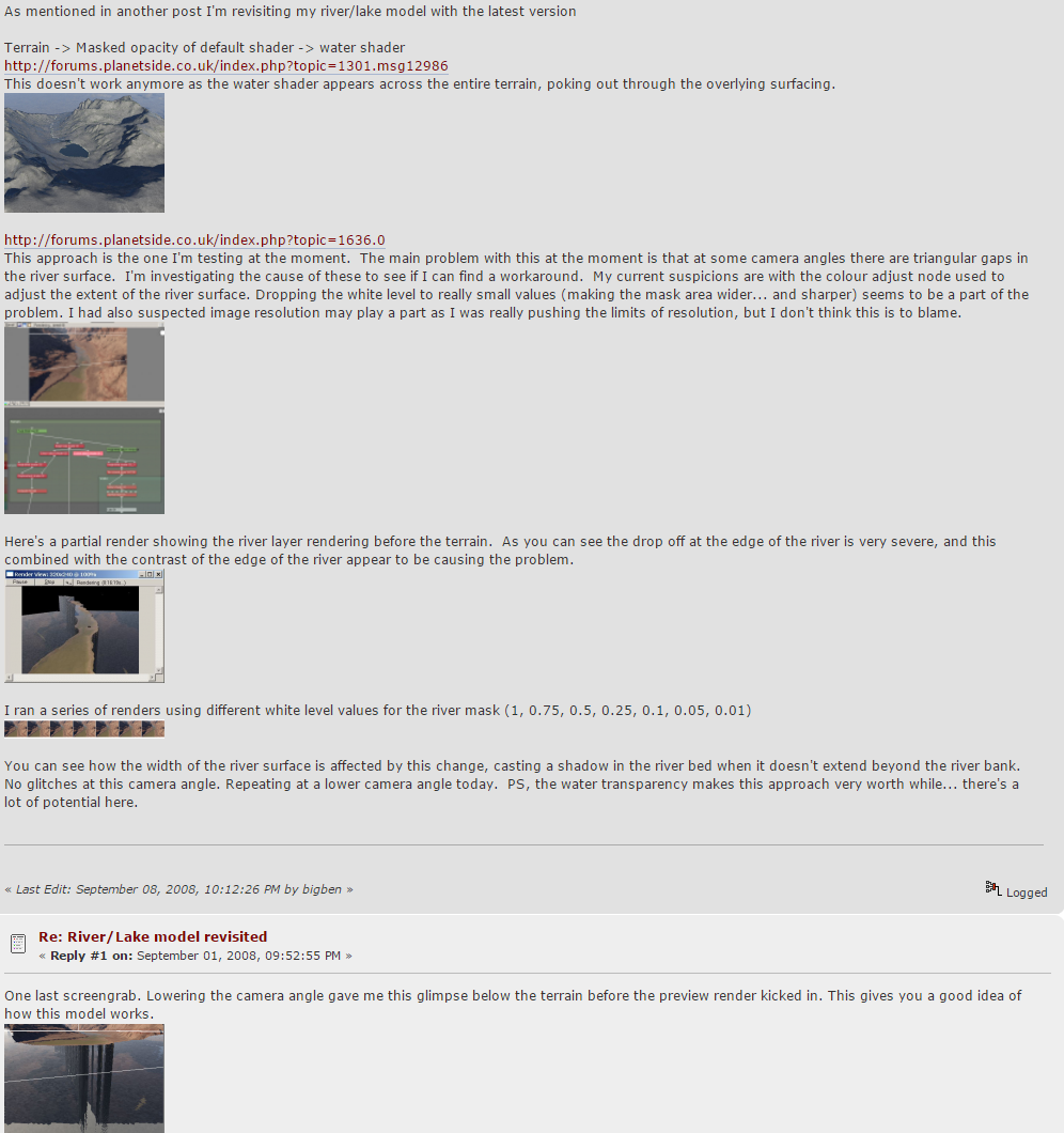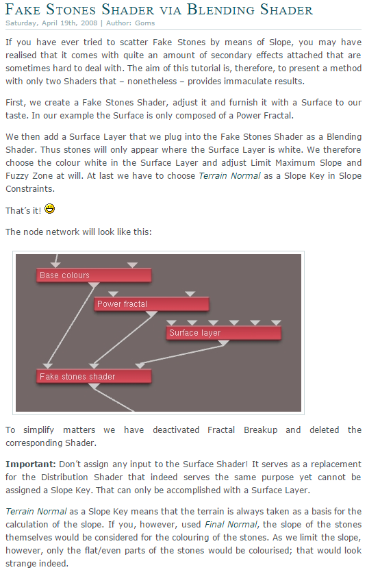 http://forums.planetside.co.uk/index.php?Topic=6432.0. http://en, tgblog.de/?p=27. http://forums.planetside.co.uk/index.php?Topic=8376.0 (efecto lava). http://forums.planetside.co.uk/index.php?Topic=7165.0 (efectos en rocas y turbulencias del agua).