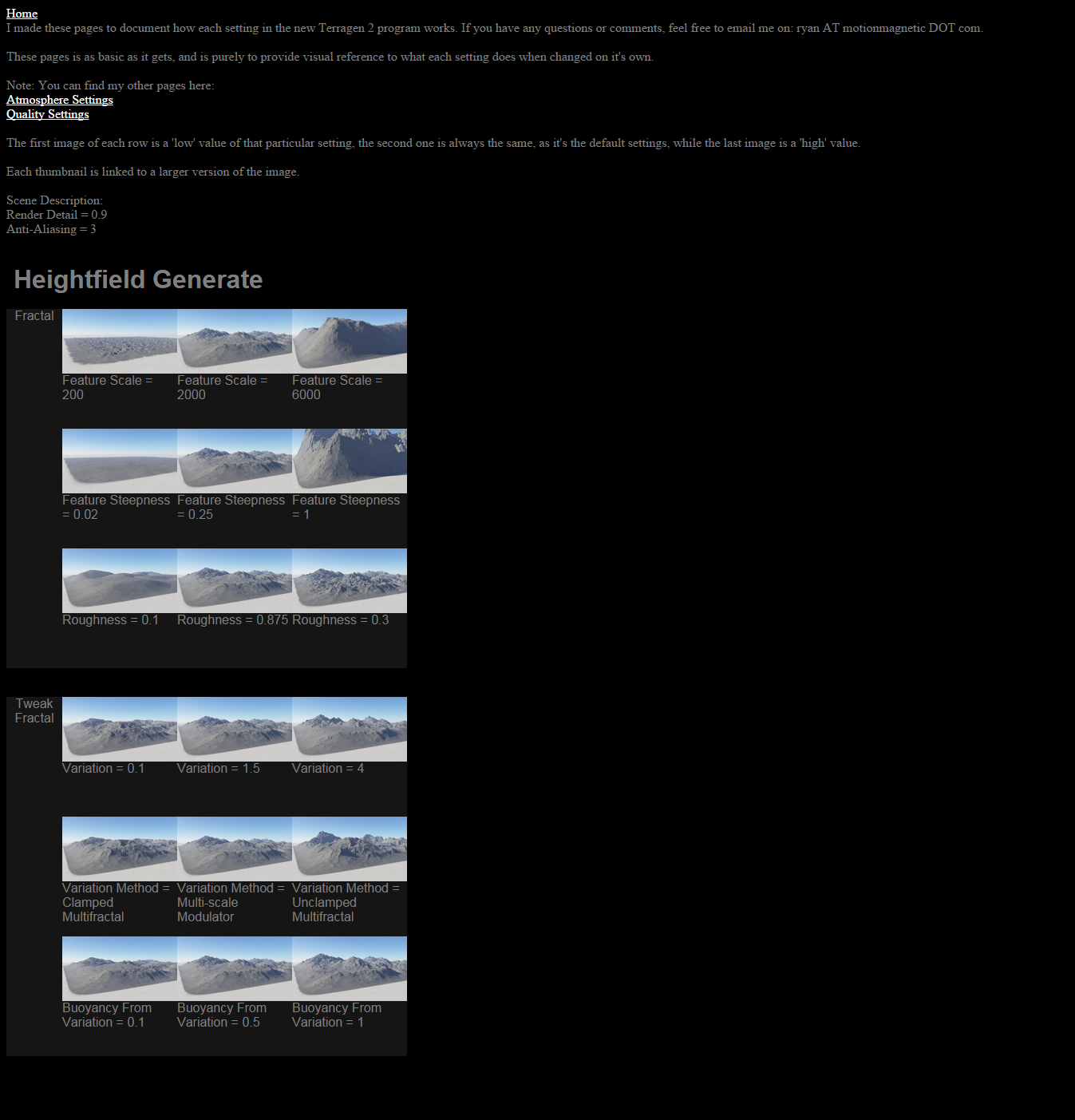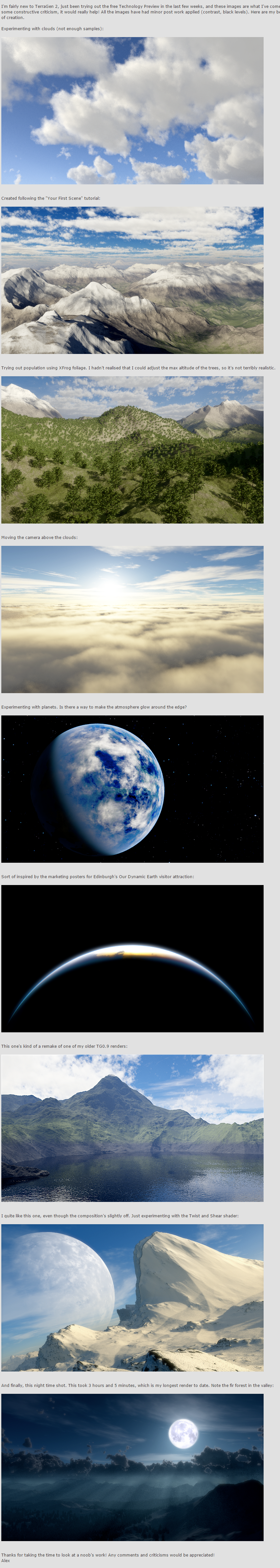 Terragen 2 es una potente herramienta para el renderizado y realización de animaciones realistas de entornos naturales. Gracias a su flexibilidad, permite crear mundos imaginarios, o importar conjuntos de datos reales del terreno, creando la visualización más realista posible. A través de su conjunto de ventanas, permite controlar el clima, paisaje, objetos, cursos de agua y océanos, soles, lunas y estrellas.