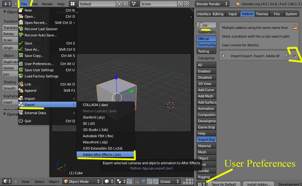 No sé nada de After, pero Blender tiene un exportador jsx. Lo activas desde user preferencias > addons.