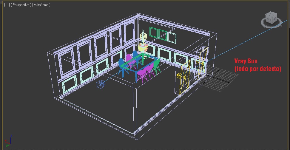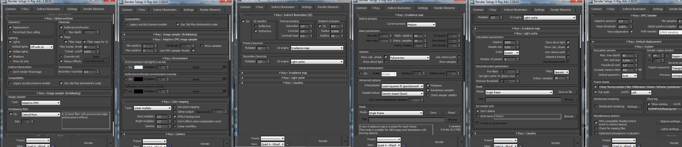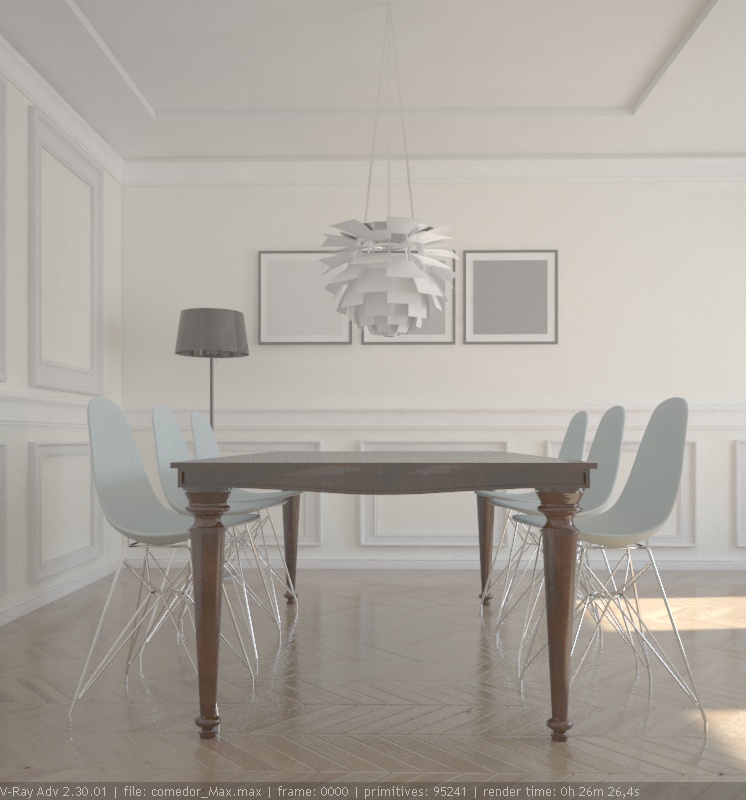 Para la iluminación utilizo Vray Sun y dos vraylights como portal (una en cada ventana) y una physicalcamara de Vray (Shutter Speed a 45 y filmsped a 100), lo demás por defecto. Además, todos los materiales de la escena son Vray material.