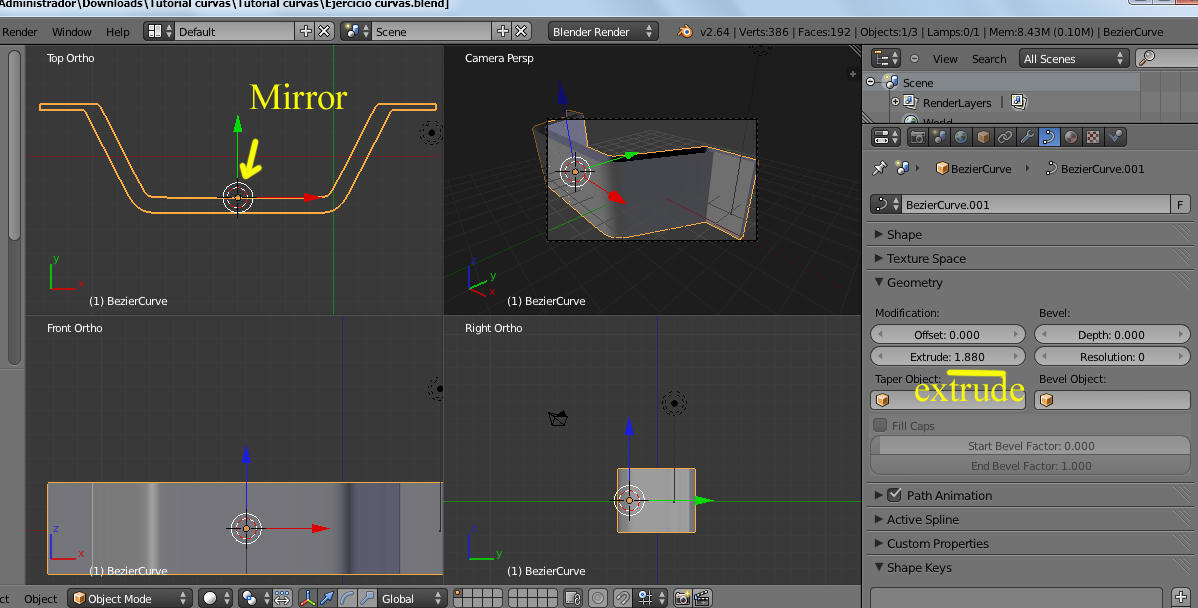 El ejercicio consiste en usar curvas de Bézier para hacer el contorno de medio canal de aguas. Bastante sencillo de hacer, pero cuando término, señalo el último vértice que he creado y el primero. A continuación pulso f para unirlos y automáticamente se me crea ¿una cara? Tras esto puedo usar el modificador espejo para hacer la otra parte del canal, pero no me deja extruirlo. En el tutorial, según las imágenes, tras pulsar f, se le queda hueco, pero a mí se me rellena por completo en color gris y creo que es como si hiciera una cara.