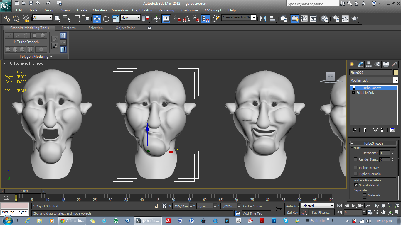 Tengo este modelo original, como verán, al costado, en la lista de modificadores, estoy utilizando el modificador Morpher y el TurboSmooth, en el orden en que se ven (tsmooth arriba, Morpher, abajo), y tengo esta copia: