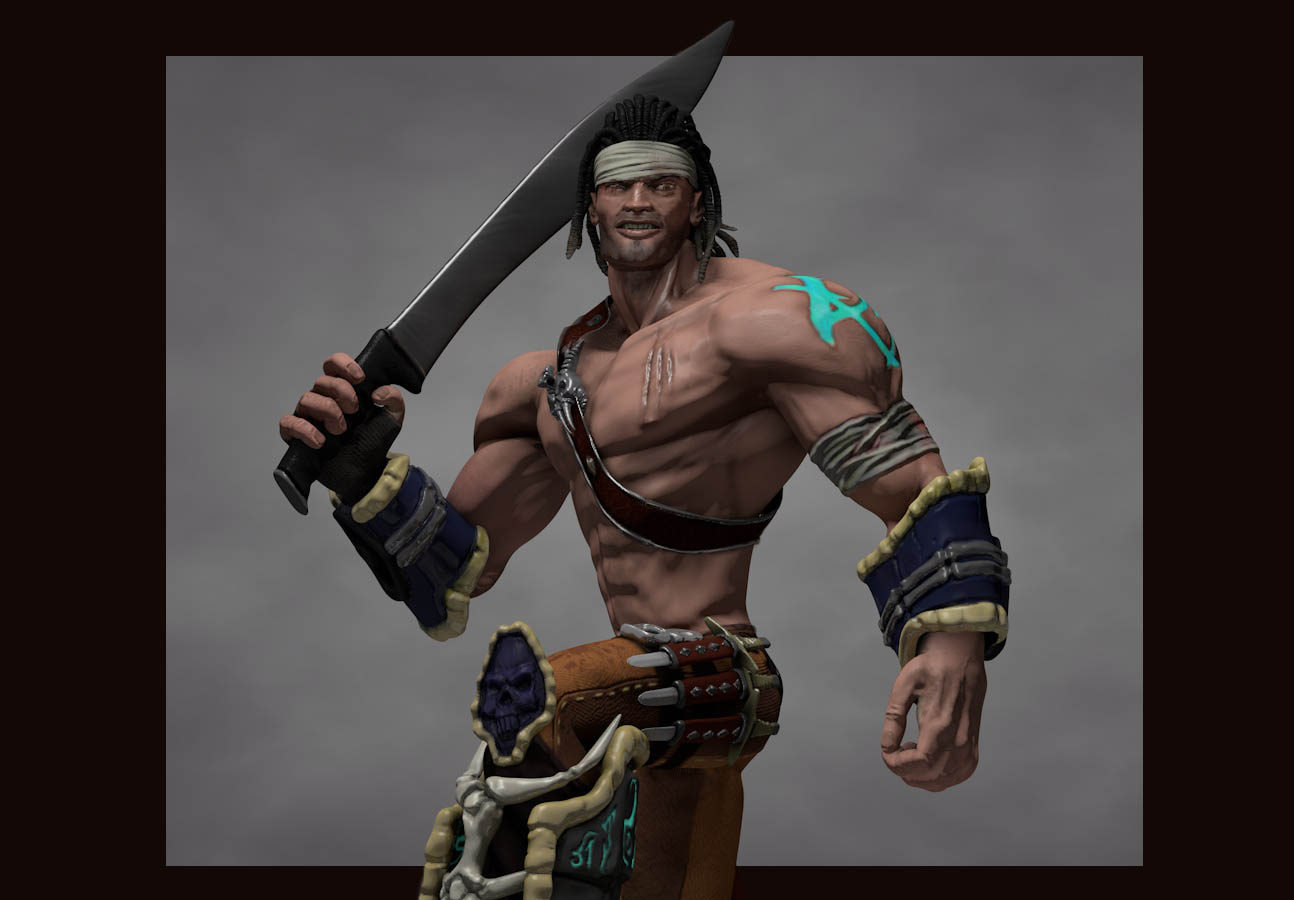Podrías poner un wire, para ver la malla. Se ve bien. Lo único que no me gusta es el nombre, para ser un guerrero del inframundo, se ve muy vivo y terrenal. (no tiene ojeras, ni esta pálido).