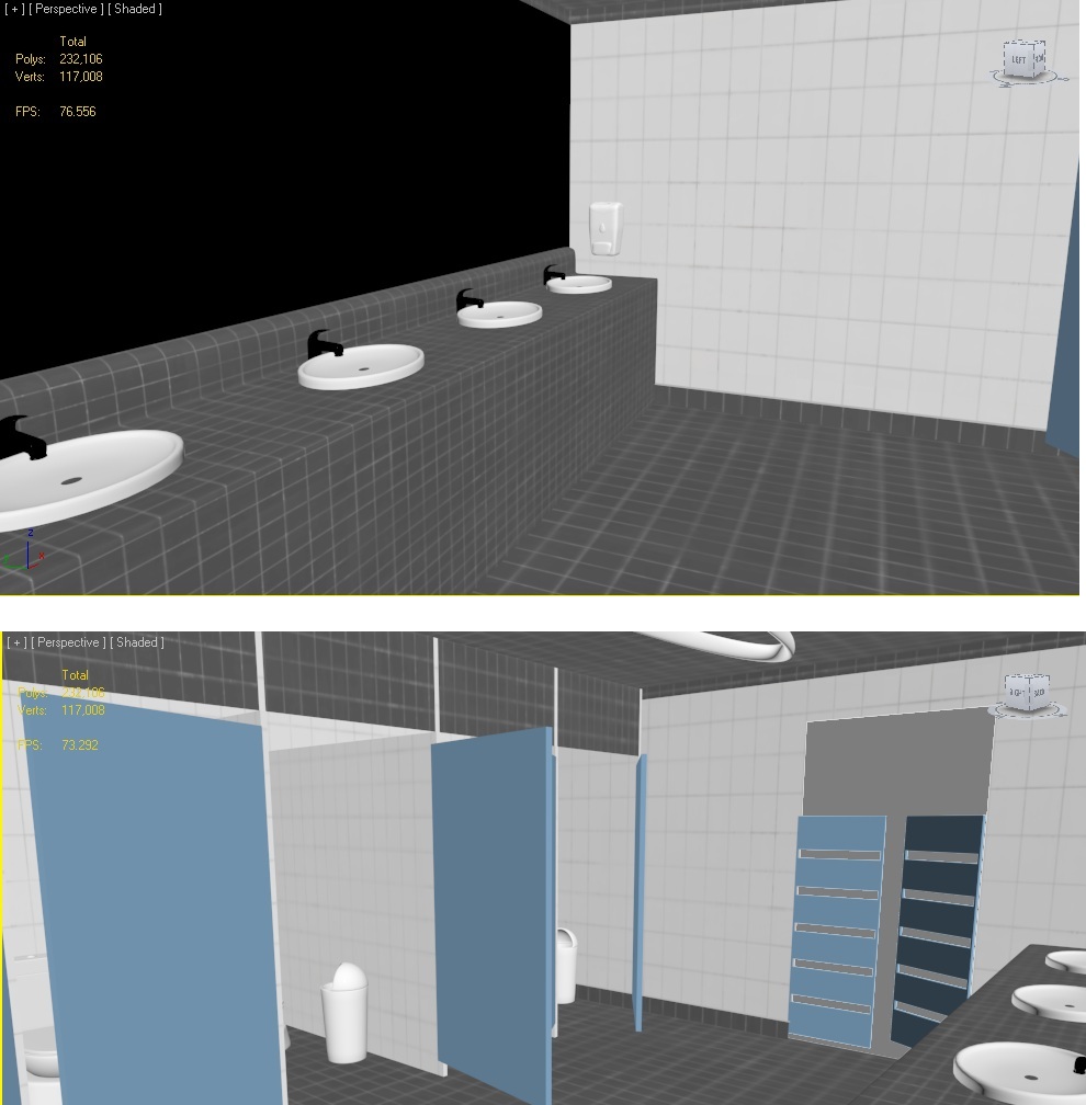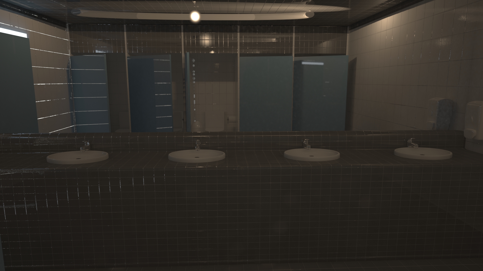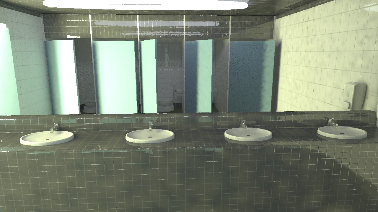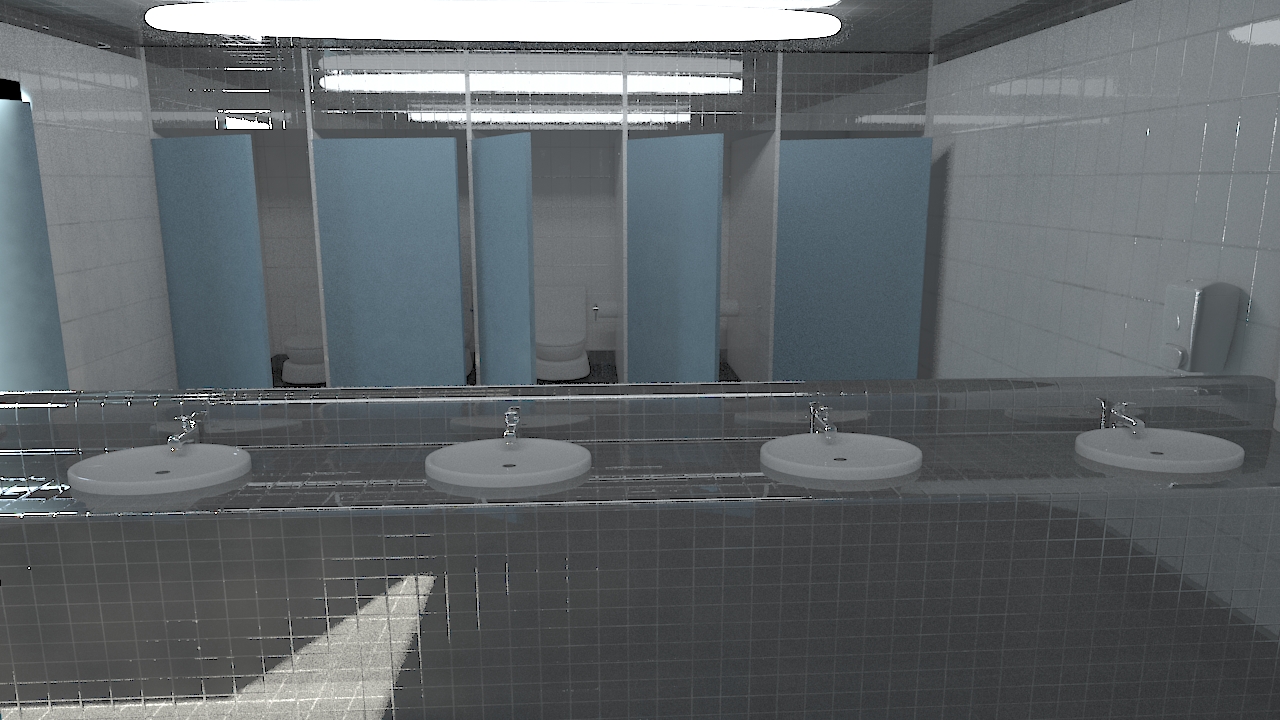 La escena es simple, un baño público (limpio) con una sola entrada, las texturas son básicas, ya que en mayoría son reflejos los que conciernen, utilizo Vray Sun para iluminar desde el exterior, directamente a la puerta, para simular que por allí ingresa la luz del día, aparte tiene una Vray light, en dirección opuesta como skylight, en eso se centra toda la iluminación, la cámara es una Vray Physical Camera, apuntando a lo que es el espejo. El problema es cuando le tiro un render básico solo de muestra, sale bastante malo, no sé si son las texturas las que están mal, o las luces, pero creo que el problema es este último, más la cámara, ya que en eso tengo menos experiencia.