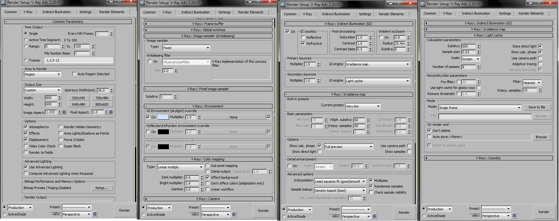 He intentado hacerlo: sin puerta, con puerta entre-abierta, con una luz más, sin Vray Sun (solo con Vray light) y he movido infinidad de veces los parámetros de todas las luces y la cámara, quisiera saber en qué estoy fallando, por supuesto les adjuntare algunas imágenes de los parámetros que utilizo, y quisiera que me critiquen de forma constructiva sobre que está mal, o que le puedo cambiar. Por supuesto que los números son realmente bajos, porque solo es un render de muestra, ya para la imagen final cambiarían muchas cosas. La última imagen es lo máximo que he podido lograr a obtener en calidad, pero no me siento satisfecho. Gracias de antemano por las respuestas.