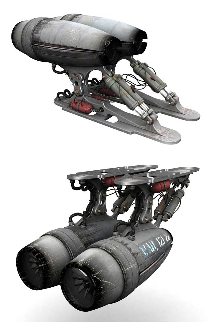 Tal y como están los motores, me recuerda mucho a los trastos que se ven en Terminator. Haz una búsqueda de imágenes (o vuelve a ver las pelis) y seguro que algo se te ocurre.