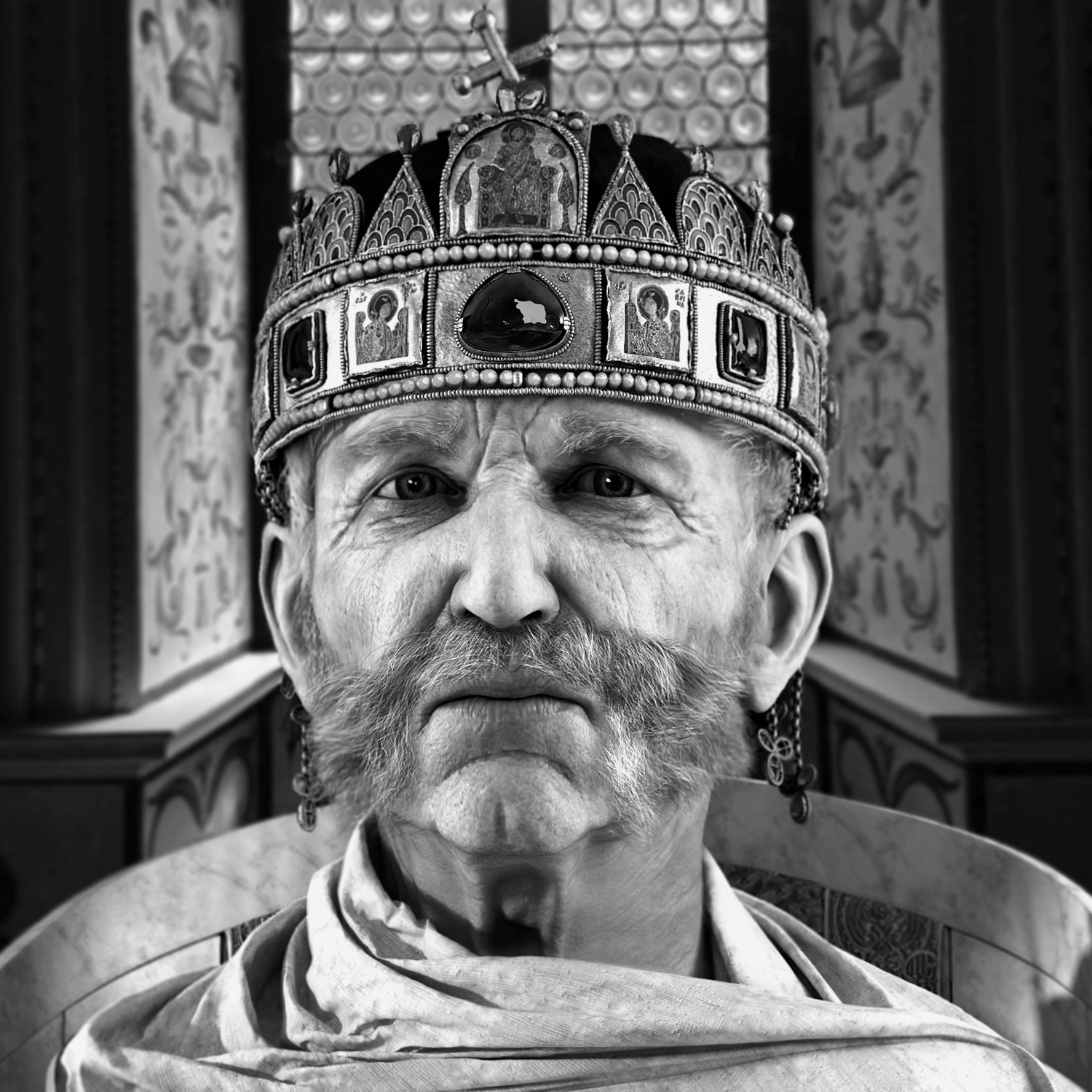 Hola, es un trabajo increíble, destaco todo el esculpido de muchos detalles, de la corona y del detalle del relieve de la piel. En contra el render final tiene una profundidad de campo sumamente extraña, el fondo no está todo lo borroso que debería estar para destacar el primer plano del rostro, y el cabello tiene un efecto de blur, que no término de encajar, la piel y los ojos, creo que si has esculpido y texturizado a este nivel, te quedaría trabajar estos un poco más (vamos sé que no es fácil) pero estoy seguro que lograras mejor acabado si les das un poco más de vueltas, ahora les veo falto de brillo especular. Vaya, la toga que lleva en el render final, ¿es una imagen 2d pegada? No corresponde según veo a la que tiene tu modelo ZBrush.