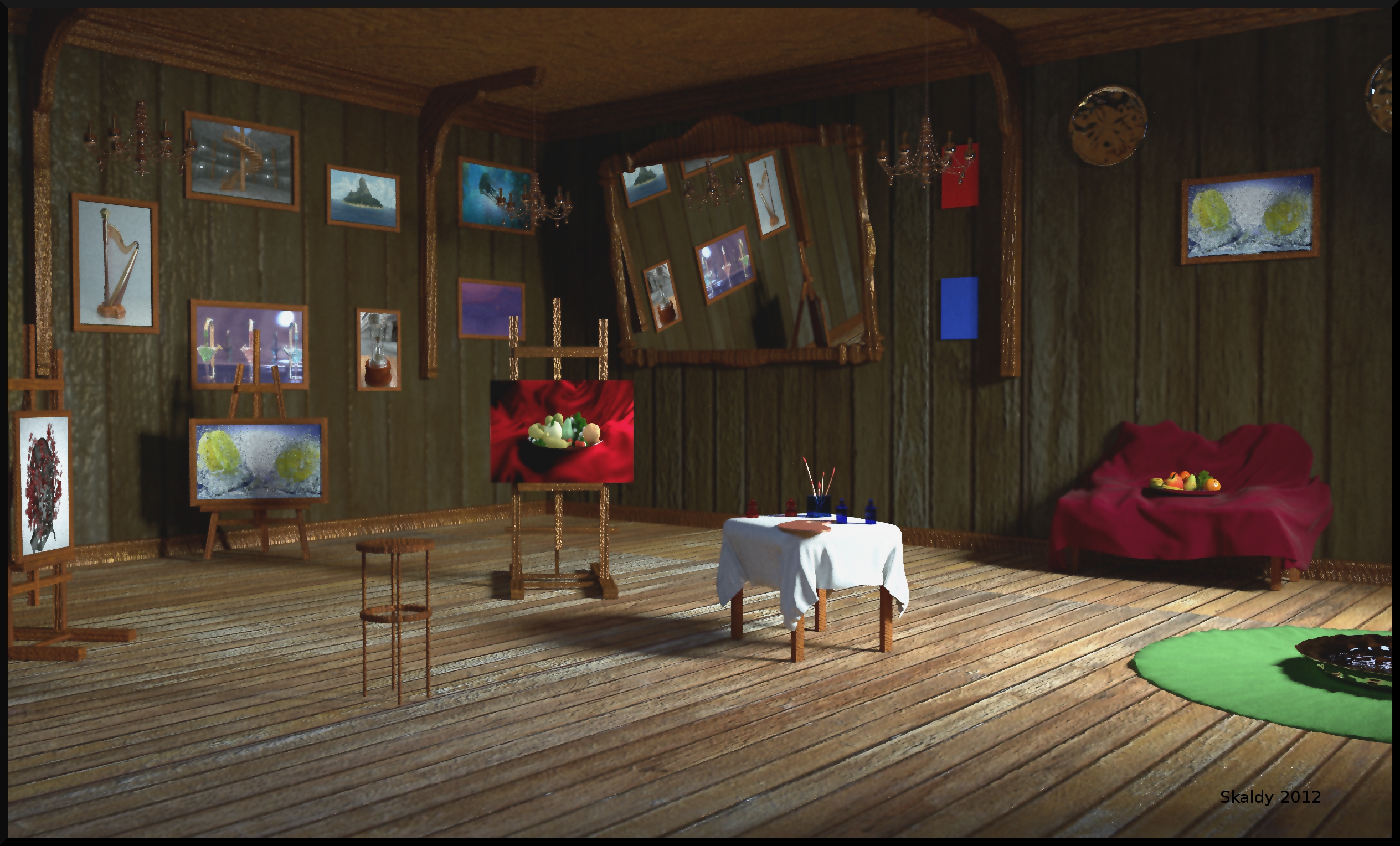 Hola buenas. He intentado mezclar la habitación clásica de un pintor, pero actualizada a lo que sería en nuestros días los nuevos pintores, o sea artistas en 3d e infografía, etc.