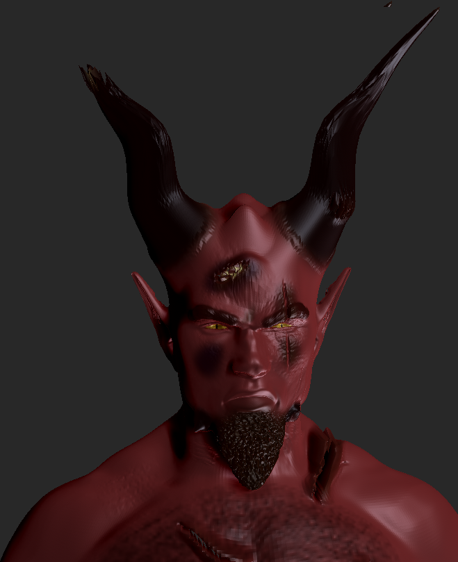 Aquí va mi primera creación semi-original con ZBrush 4. Y digo semi-original porque cogí la parte más difícil (hay que admitirlo), o sea, el busto de un ser humano ya diseñado, y le he añadido todos los detalles para hacer el busto de un demonio después de un combate. Hay muchos fallos, pero para comenzar a practicar no va mal: