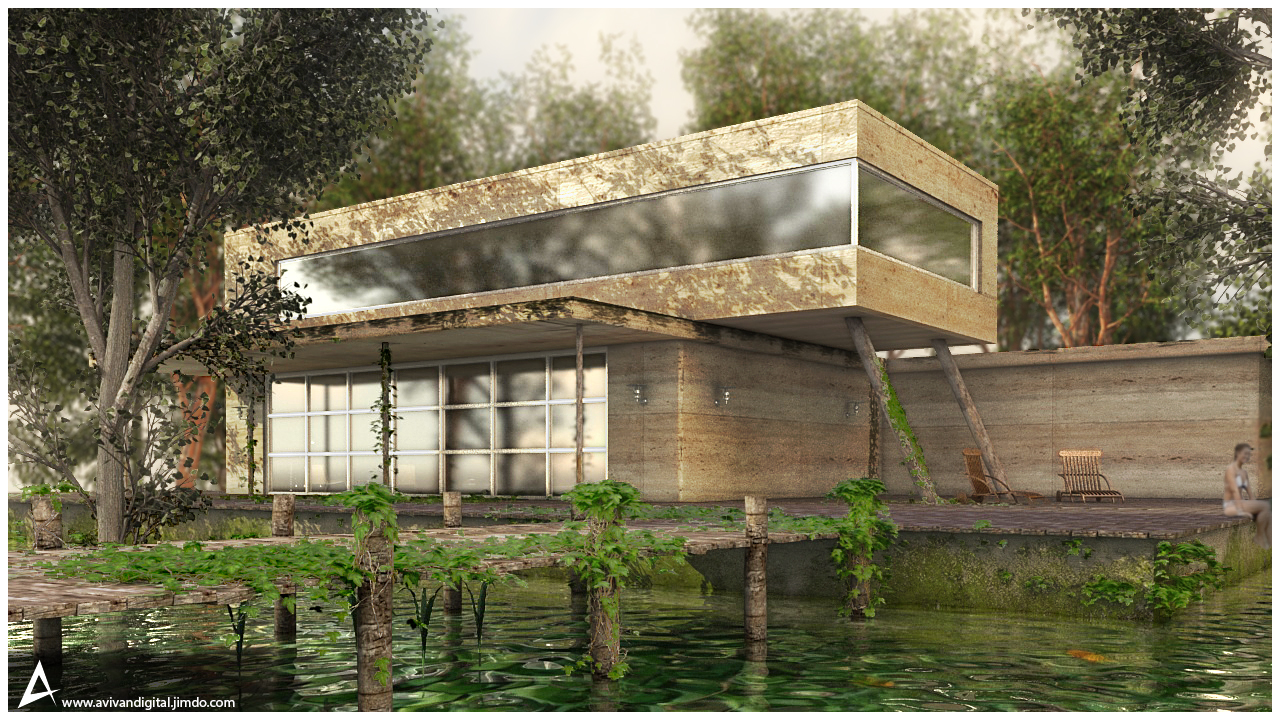 Como puedes ver del modelo no digo nada. A mí también me gusta este tipo de arquitectura tipo Fallingwater de Wright o casa farnsworth, etc. La composición de la imagen, el encuadre (no confundir con la composición técnica) también me gusta, resumiendo, para mí esta imagen esta a medio terminar.