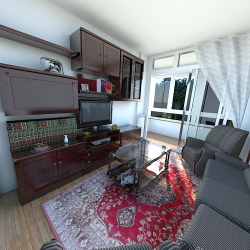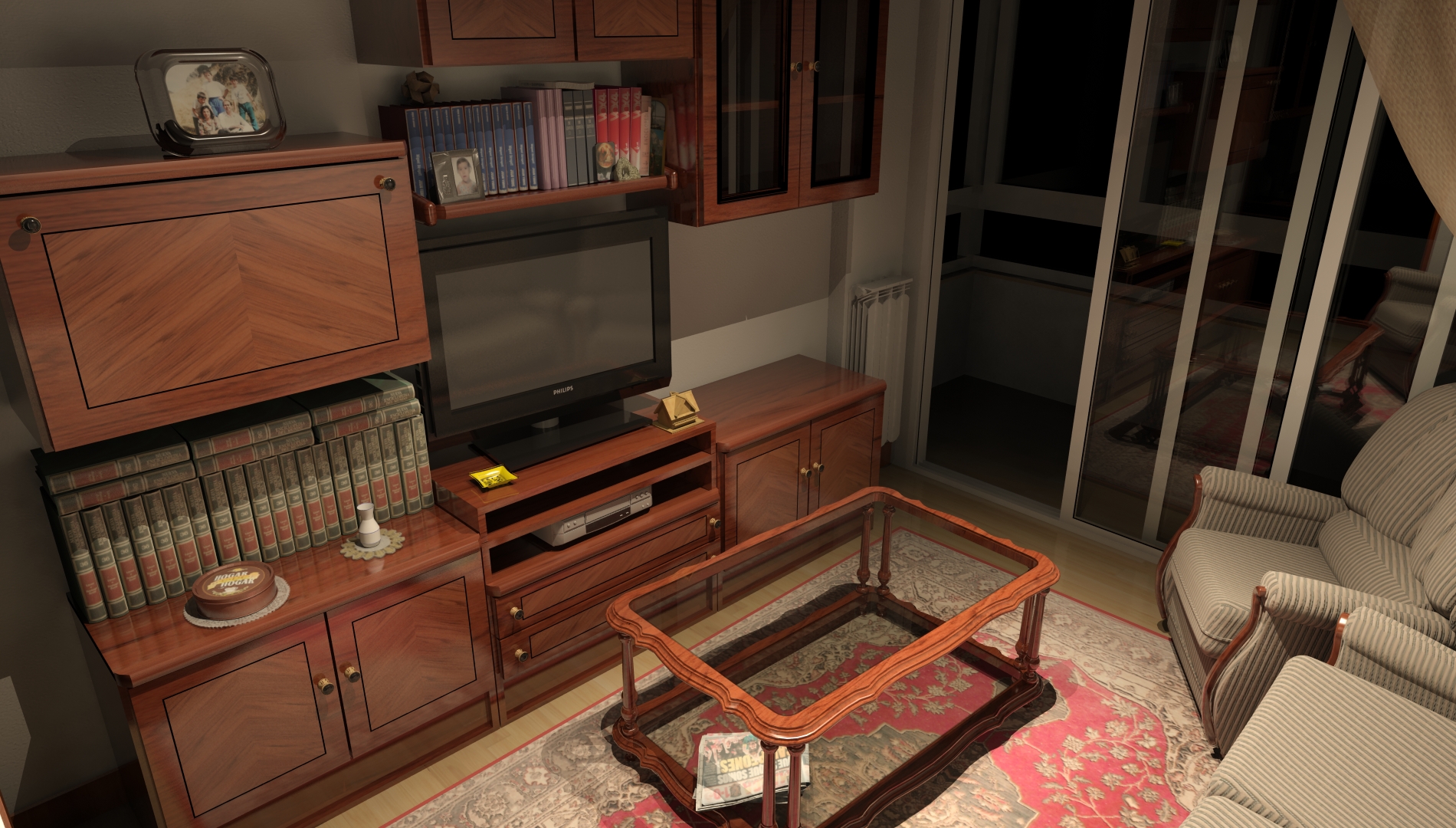 Hace ya casi un año descubrí la posibilidad de hacer dibujos 3d con mi ordenador y, aunque no trabajo en nada de esto cuando tengo tiempo intento practicar, aprender y mejorar, porque me gusta mucho. Este fue mi primer intento serio de hacer algo parecido a la realidad, basado en el salón de mi casa.