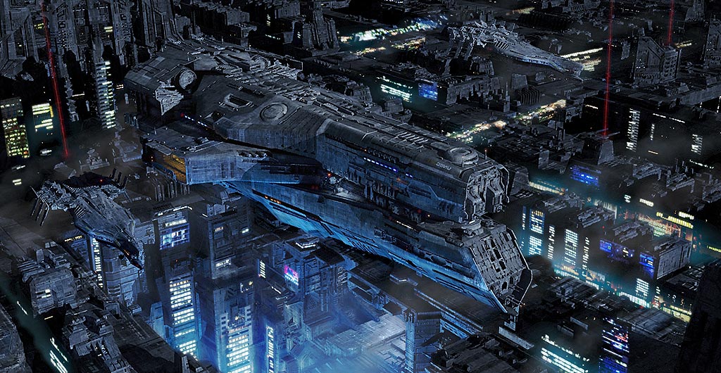 Que buena amigo, igual como imagen es un poco caótica, se tarda un poco en diferenciar la nave de la ciudad, lo más seguro que en una animación ese problema no lo tendrías, en la segunda imagen ese problema está muy corregido, aunque como ya había visto la primero sabía donde mirar, por el resto espectacular, el diseño de las naves me ha gustado mucho. Saludos.