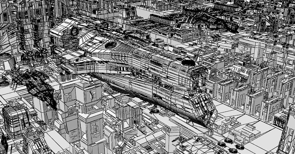Buenas, veo un modelado impresionante, pero una composición e iluminación que lo echan mucho a perder en cuanto a finalización. También coincido con Fiz3d en esto. Sobre todo, es la saturación de azul, igual añadiendo ligeras tonalidades a distintos objetos, edificios, nave o cambiando la composición con un fondo más neutro para la nave y la ciudad en otro, no sé, es probar. La oscuridad total que da en el plano de algunos edificios a cámara, tampoco ayuda mucho, trabajaría más la iluminación buscando separar elementos, también pequeños cambios en las texturas, planchas con distinto desgaste, una línea de color (como las naves de la república en la última de Star Wars, que imitaban los galeones españoles del siglo XVI, con una banda de color rojo, creo) o pequeños stencils repartidos, numerales, me gustaría si pudieras subir pronto updates o unas imágenes con más resolución de esa malla 3d, veo muy buen modelado, me parece, así que, enséñalo, lucelo, no lo escondas.