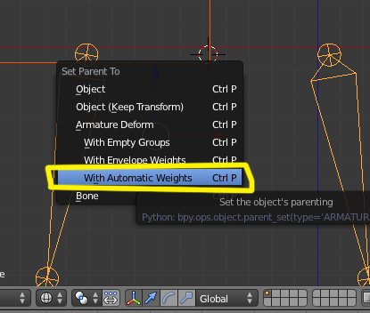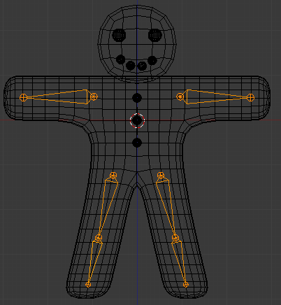Ahora coloca el cursor en el centro (&#8679, shiftc) y selecciona todos los huesos con a. Duplica estos con &#8679, shiftd e inmediatamente sal del modo de agarre con Esc. Asegúrate de que el cursor esté seleccionado como el pivote de rotación/escala (de la lista de selección pivot -pivote- En la cabecera de la ventana 3d). Voltea los huesos duplicados a través del eje X relativo al cursor con ctrlm y luego x. Terminaras con (el armazón completo luego de duplicar y voltear).