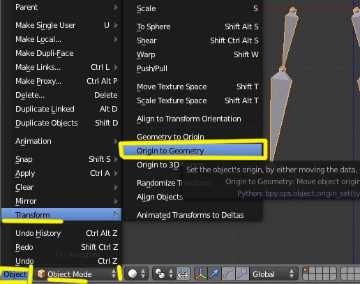 Esto coloca el cursor en el centro de esa selección, luego cambiamos a object mode, y entonces seleccionamos la opción, object > transform > origin todo 3d cursor)colocar el origin en la posición del cursor)