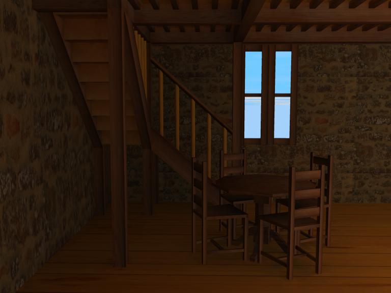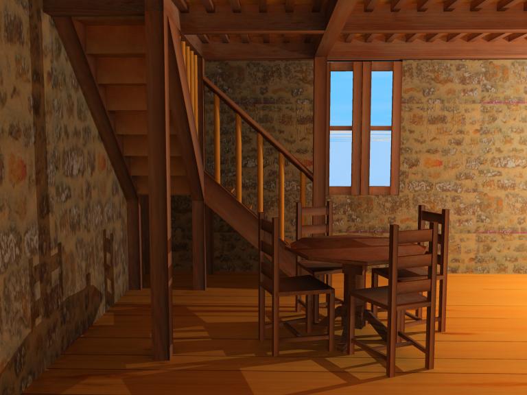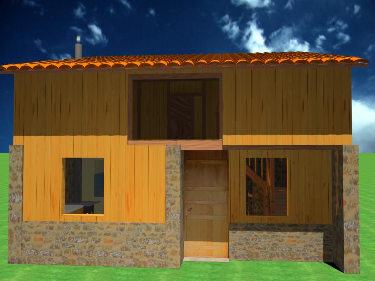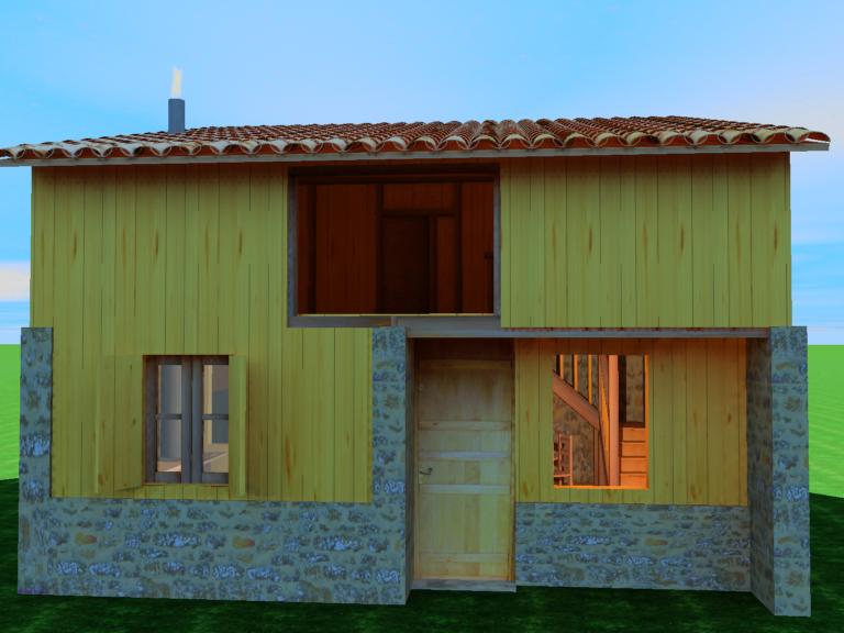 Suaviza las aristas de los bordes. El ventanuco de madera de la derecha parece más grande que el hueco de la ventana y los listones de todas las ventanas deberían ser todos iguales, no unos más anchos que otros. La chimenea parece un mechero encendido, yo le quitaría ese fuego o humo.