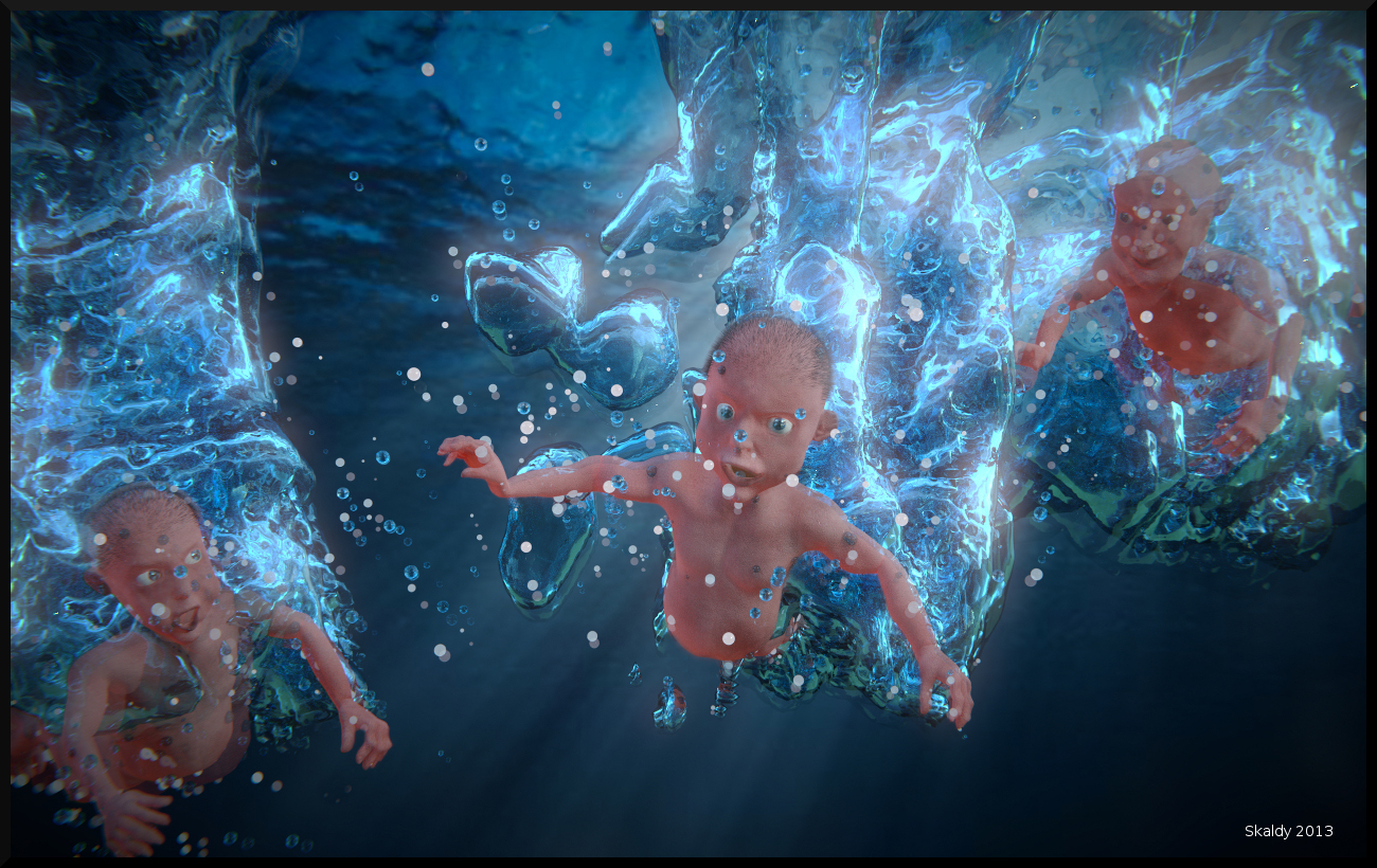 Buenas. Os dejo mi último y acabado render. He usado la malla de cookie Flex Rig versión 1.2, para esculpir en Blender 3 bebes, introducirlos en una piscina con un sistema simulación de agua y unas partículas por aquí y por allí, un material simulando s en Cycles. 300 pases, mensaje composición en Blender y Adobe Photoshop.