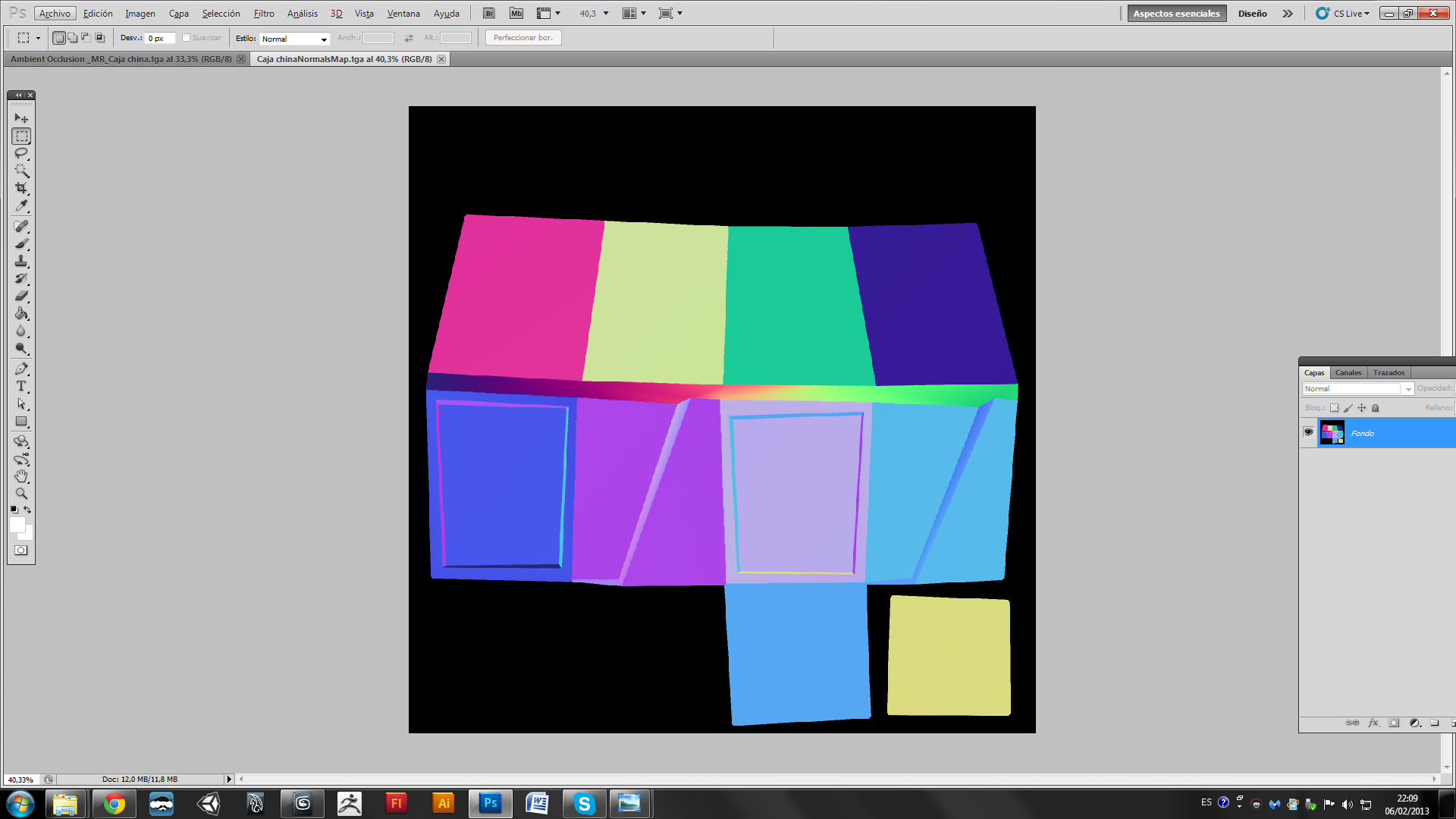 He creado un modelo de alta y otro en baja para proyectarlos uno encima de otro. Me hacía cosas muy raras así que, probé a hacer un modelo básico para ver si el problema era de esos modelos. Hice un render to texture normal sin proyección y me pasa lo mismo. Así es cómo se ven las normales. De hecho, hay veces que me aparece todo de un color homogéneo cuando hago las normales sin trabajo, como si no captase la información, y a veces me hace esto. Este es el error más molesto, pues es el que también me ocurre al trabajo.