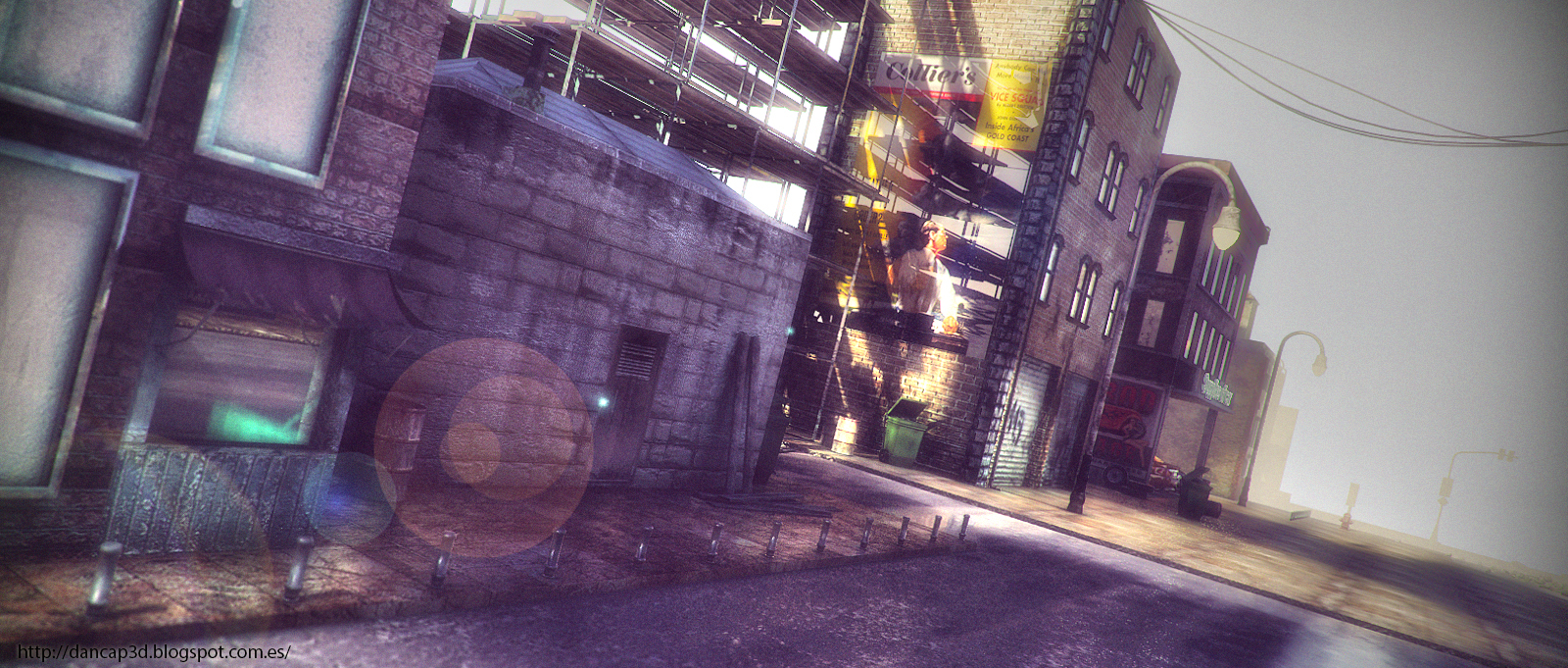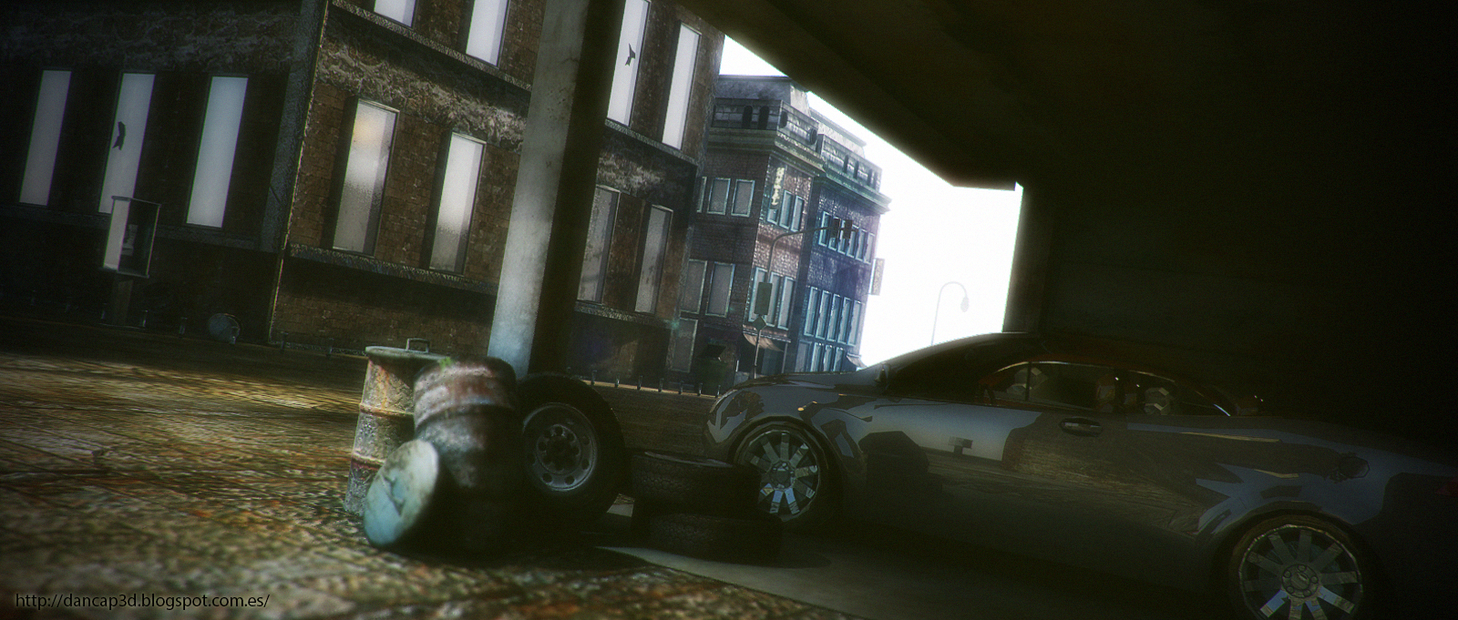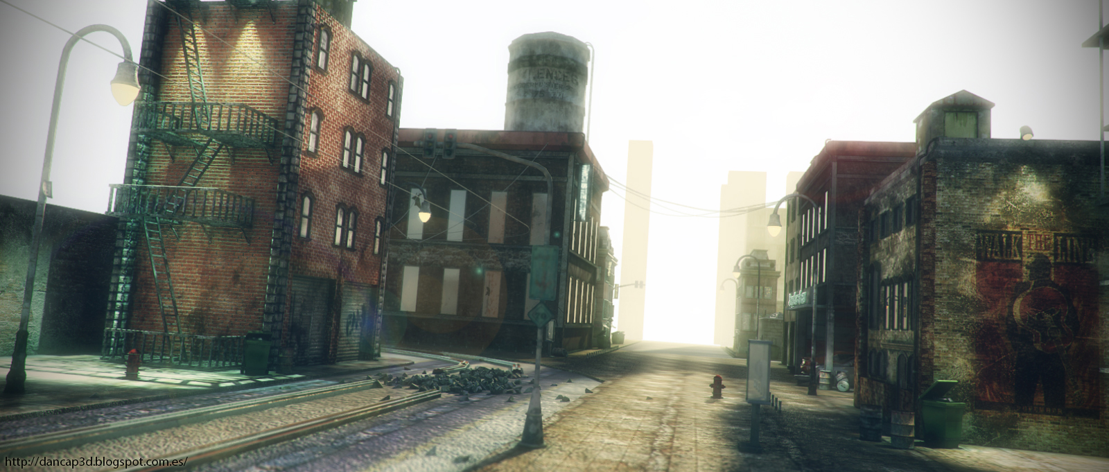 La verdad se ve muy bien(excepto el material del suelo, necesita una textura de alta resolución con specular y normal map) me gusta, aunque deberías haber modelado más estructuras para poder así, llamarla ciudad, pero me gusta.