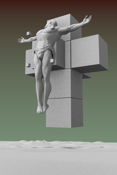 Modelado en Blender de. Perspectiva de una cruz formada por una proyección de un cubo desenvuelto o en 2d Hypercubo, render Cycles, posstcomp Blender y Adobe Photoshop.