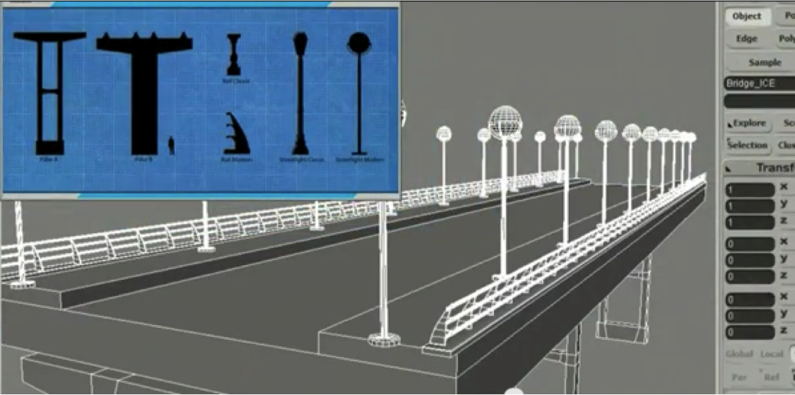 Y todo eso, se puede conseguir uniendo los diferentes nodos que nos ofrece ICE. Como habréis observado, además, ICE nos permite importar modelos creados por nosotros mismos en Softimage(como en este caso las farolas, las columnas o las barandillas) para incluirlos como componentes del modelo procedural.