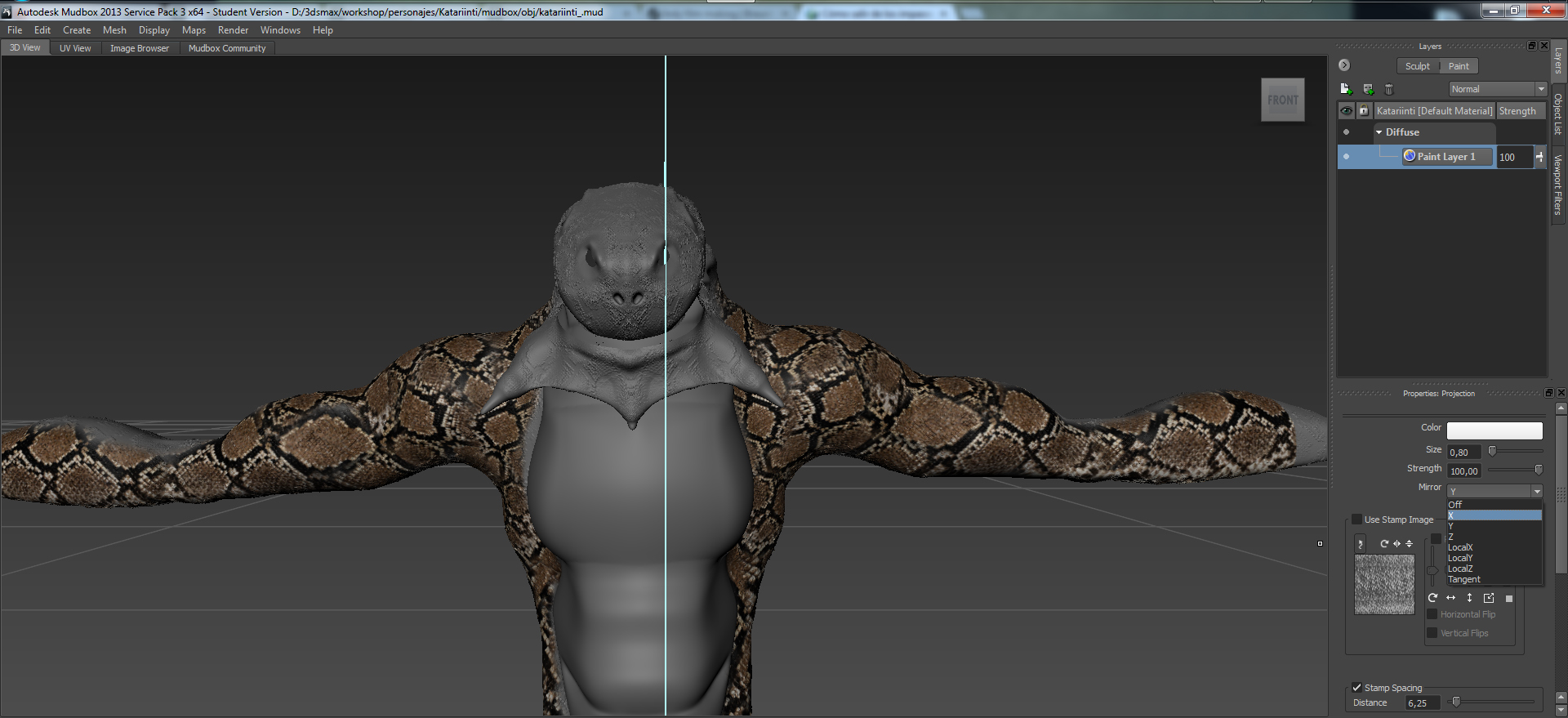 Escribo con el fin de pedir ayuda respecto a un impasse que tengo en la aplicación de texturas en mí modelo de Mudbox; voy a anexar para dejar ver cómo fue que se perdió la simetría. Ya intenté con el aparte de movimiento en la opción de rotación, escala y posición.