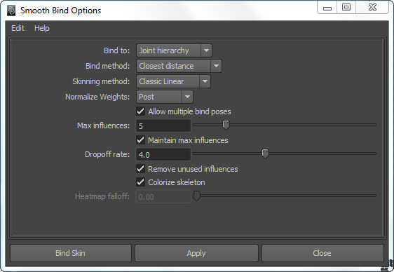 igid binden lugar de Smooth bind. Elimina el skinNode y vuelve a hacer la asociación entre joints y la geometría, esta vez usando Smooth bind, a ver si eso funciona, aunque por lo que se ve en el Component Editor parece que usaste esa opción. Por probar.