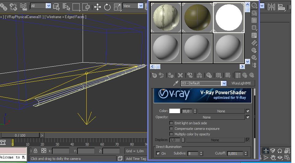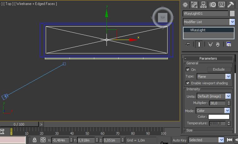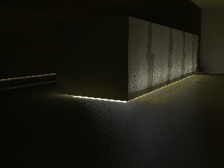 Hola. Aquí te muestro cómo puedes hacerlo, coloco una Vraylight con parámetros por default a unos 5 centímetros del suelo, apuntando hacia este, notaras que solo ilumina y se refleja en el suelo. Además, y como prueba, coloco en el costado un cilindro el cual convertí a editable poly y borre parte de el que da hacia la pared del centro, aplique ha este un VraylightMtl, luego y para que no se vea, fui a propiedades de objeto (del cilindro) y desmarque rendereable. Entonces puedes borrar la Vraylight interior y usar los cilindros con Vraylightmtl, La verdad que no he realizado iluminación así, tu lo puedes modificar y espero que te sirva como idea. Saludos.