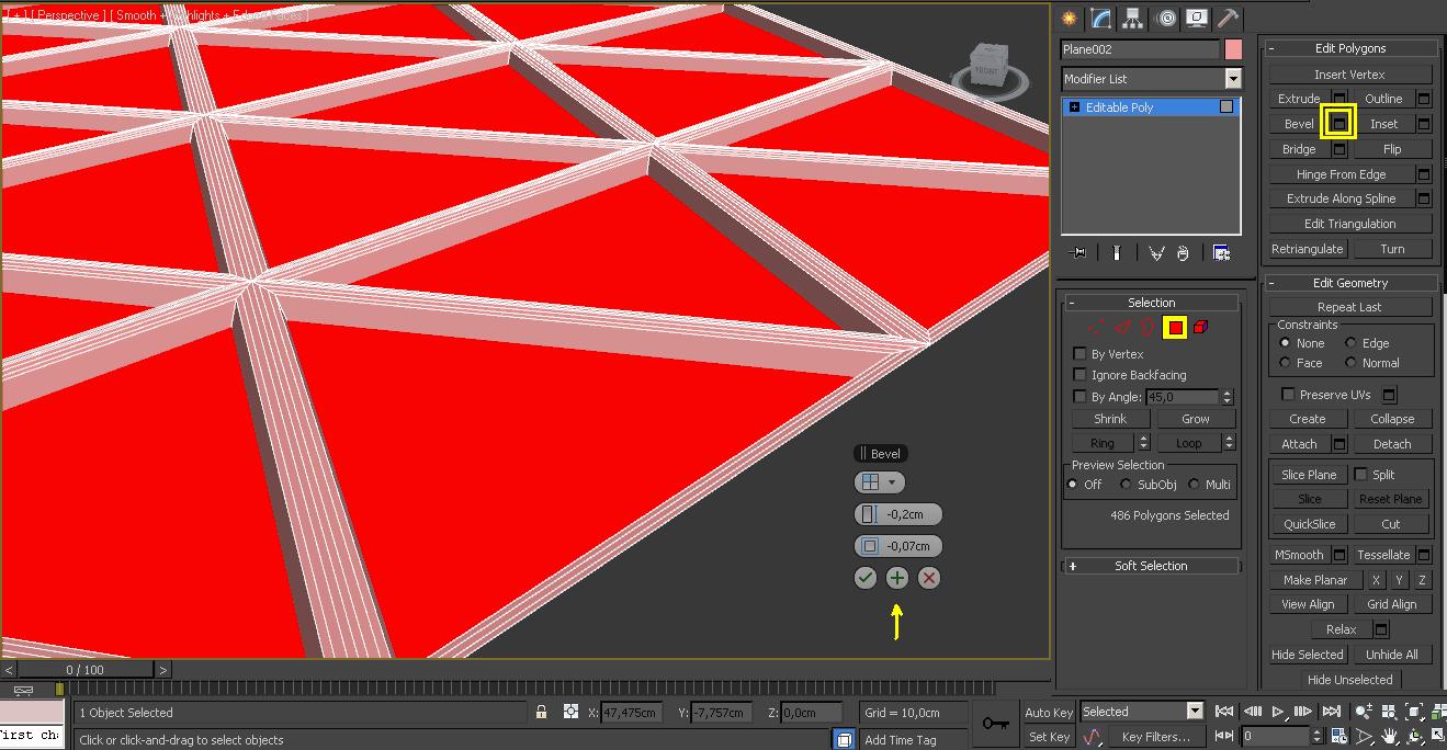 Cre un plano de 100 por 100, 1 cara únicamente, le hice un WELD para unir 2 puntas, quedo un triángulo equilatero, lo multiplique 9 veces, arriba y abajo, quedo la base, y luego simplemente fui subiendo hasta obtener 18 triángulos en el medio, le hice un mirror (todo es una instancia., luego le hice un Extrude a todos los polígonos (faces), y se obtiene esta cosa fea, que no entiendo por que ocurre así.