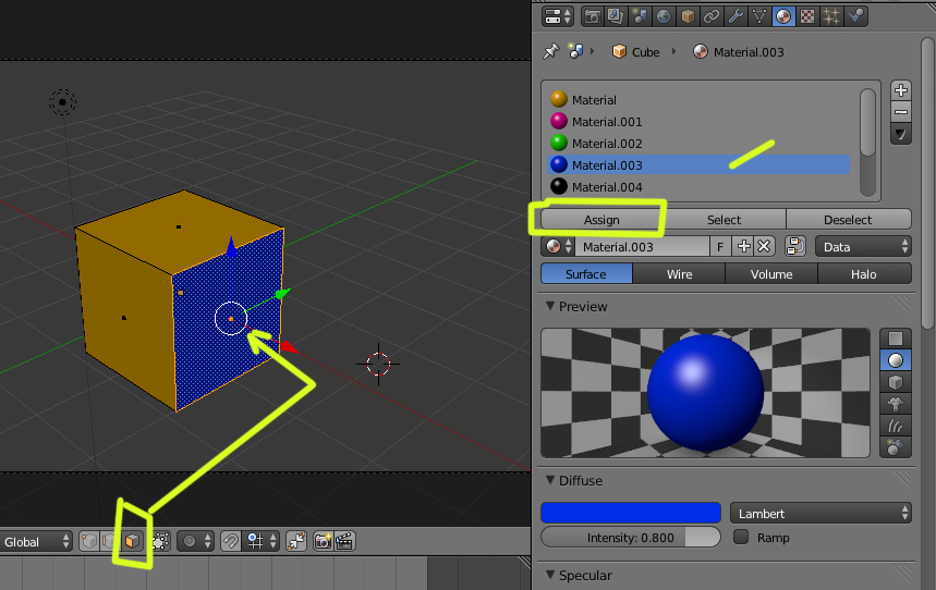 Luego para asignarle el color a las caras, te pones en EDIT MODE y en selección de caras (Face Selected), seleccione un color y presionas el botón ASIGN.