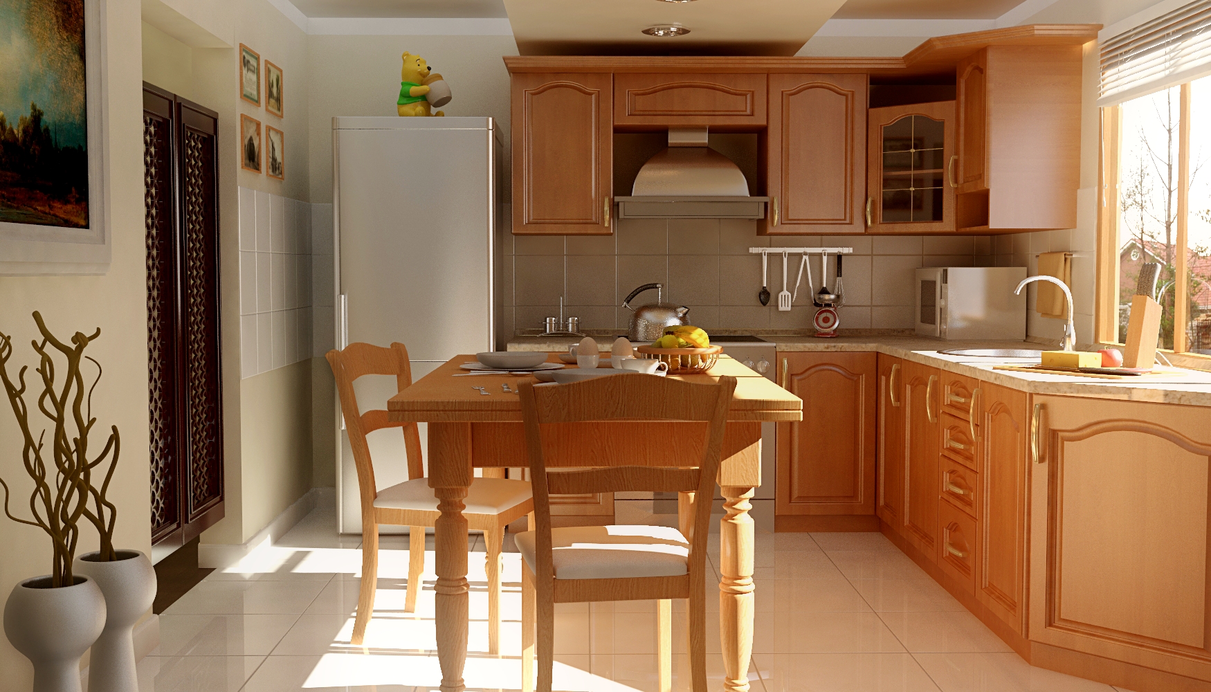 Yo siento que e fallado en la iluminación del techo, no me parece real, también la mesa no me convencen las sombras, tampoco el marco del cuadro blanco, hay un destello de luz en el repostero parte superior derecha junto a la ventana qué es irreal, la textura de la tabla de la mesa no me convence, aún hay mucho ruido en varios objetos.