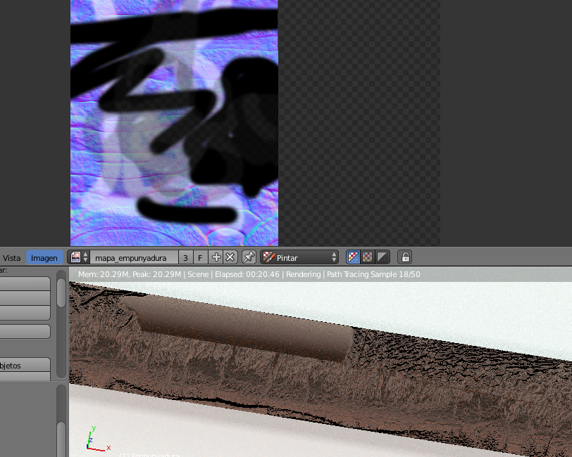 El mapa de normales, no se pinta. Esa imagen tiene una característica especial que crea el efecto de relieve en la imagen a la vez que crea un efecto como de sombra en las partes contrarias a la luz.