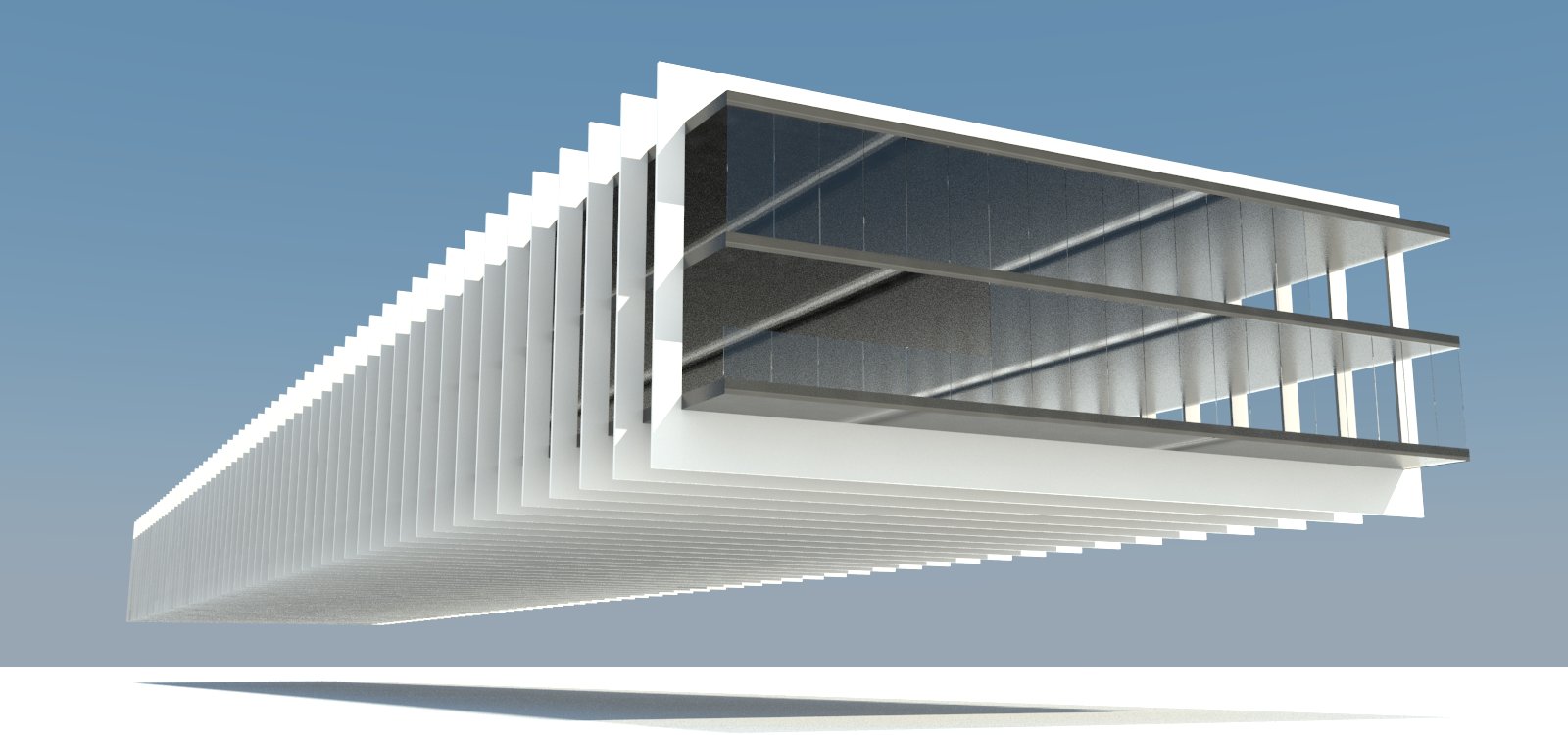 1º: Creo una escena en SketchUp y configuro los parámetros para iluminar el edificio. Lo mismo hago con los materiales. Los creo, aplico texturas, mapeados, reflejos, etc. Una vez que he hecho esto, guardo la configuración y exporto los parámetros de iluminación (en un archivo.visopt) y los materiales creados (en archivos.vismat). Al renderizar me genera el render 1 (que adjunto a continuación)