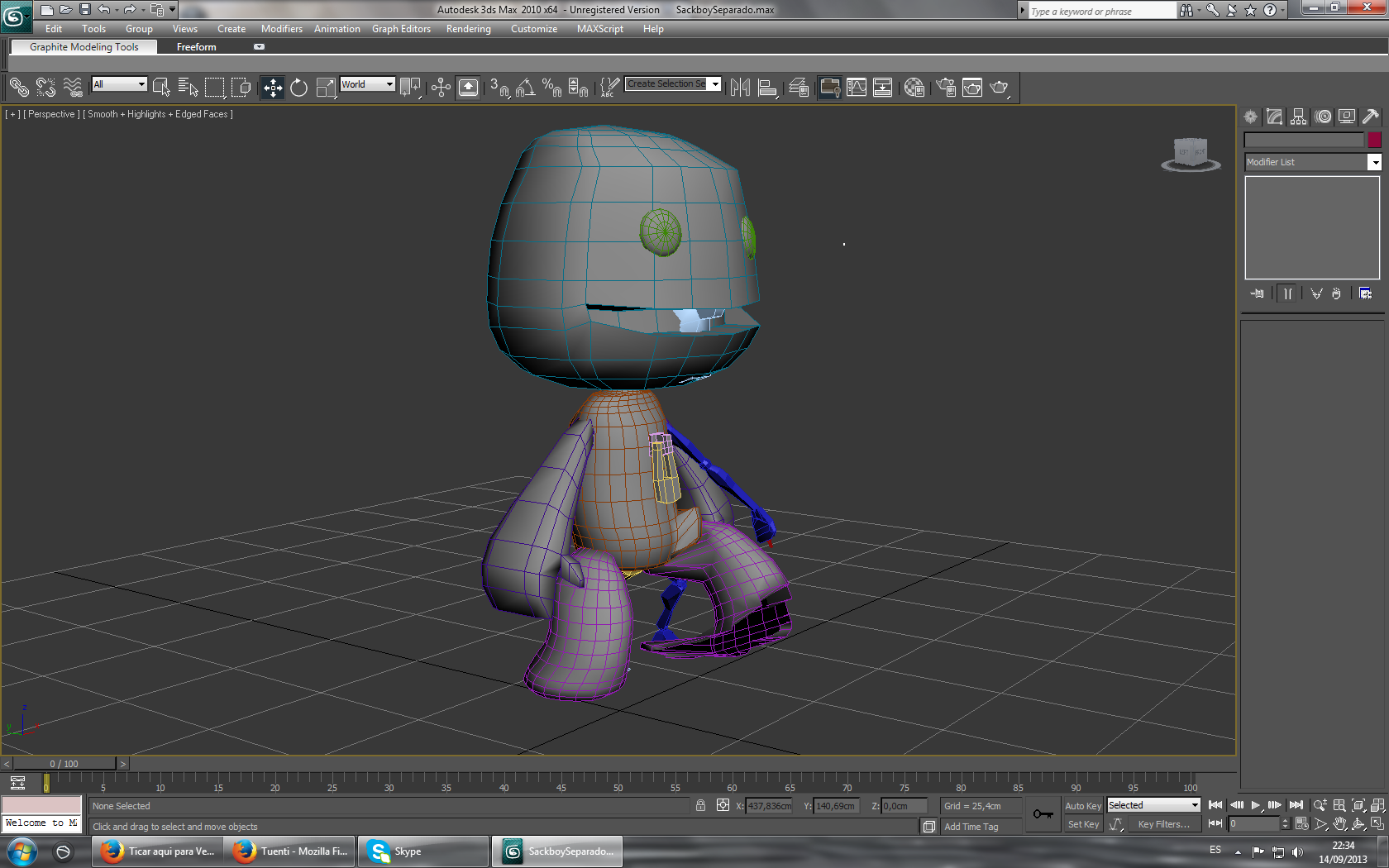 Hace unos días termine de modelar y texturizar un sackboy (muñeco de Little Big Planet) con pocos polígonos. Fue hoy cuando decidí empezar a animar utilizándolo, al principio intenté hacer una estructura de huesos manualmente, uniendo los huesos yo, pero luego salió el mismo problema qué diré a continuación y me dije a mí mismo de utilizar mejor la estructura Biped. Todo fue bien, ajusté perfectamente los huesos al cuerpo, una vez posicionado el Biped, puse para que solo pueda seleccionar la geometría y seleccione todas las partes del cuerpo (está separado por las partes estas: cabeza, torso, brazos y piernas, aparte de un añadido en el torso que podréis ver en la imagen, pero que no necesita un hueso), a continuación, les puse un modificador Skin y añadí los huesos del Biped. (Antes de Skin las partes tienen puestas un Edit Poly y solo la cabeza Unwrap UVW, no sé si afectara en algo eso, cosa qué dudo, pero bueno, ahí les doy el dato)Luego cambie para que solo se puedan seleccionar los huesos y probé a mover la mano.