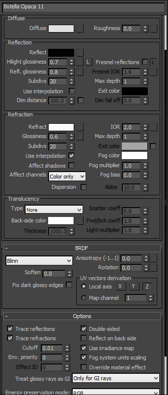 Hola, es la primera vez que escribo en el foro ya qué siempre resuelvo mis problemas dándole una mirada a los temas, pero ahora tengo un problema para él que no encuentro la solución, resulta que estoy haciendo una botella de plástico con un líquido azul, para lo que utilizo Vray, el problema es que el líquido se refleja mucho en la parte superior de la botella y por más que cambio los parámetros de ambos materiales no doy con la solución, la verdad no soy un experto y por eso espero que alguien pueda ayudarme, agradezco de antemano su ayuda. Ddejo algunas imágenes de cómo tengo los materiales y una muestra del resultado final para qué entiendan a lo que me refiero: