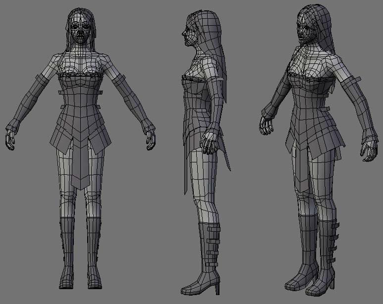 El modelo high-poly esculpido es importado a Blender y diezmado a un conteo de polígonos que sea trabajable. Creo el modelow-poly alrededor del high-poly y lo desenvuelvo (unwrap). Los modelos High-poly y low-poly son tomados de 3DStudio Max para él bakeo de normales y del lightmaps.