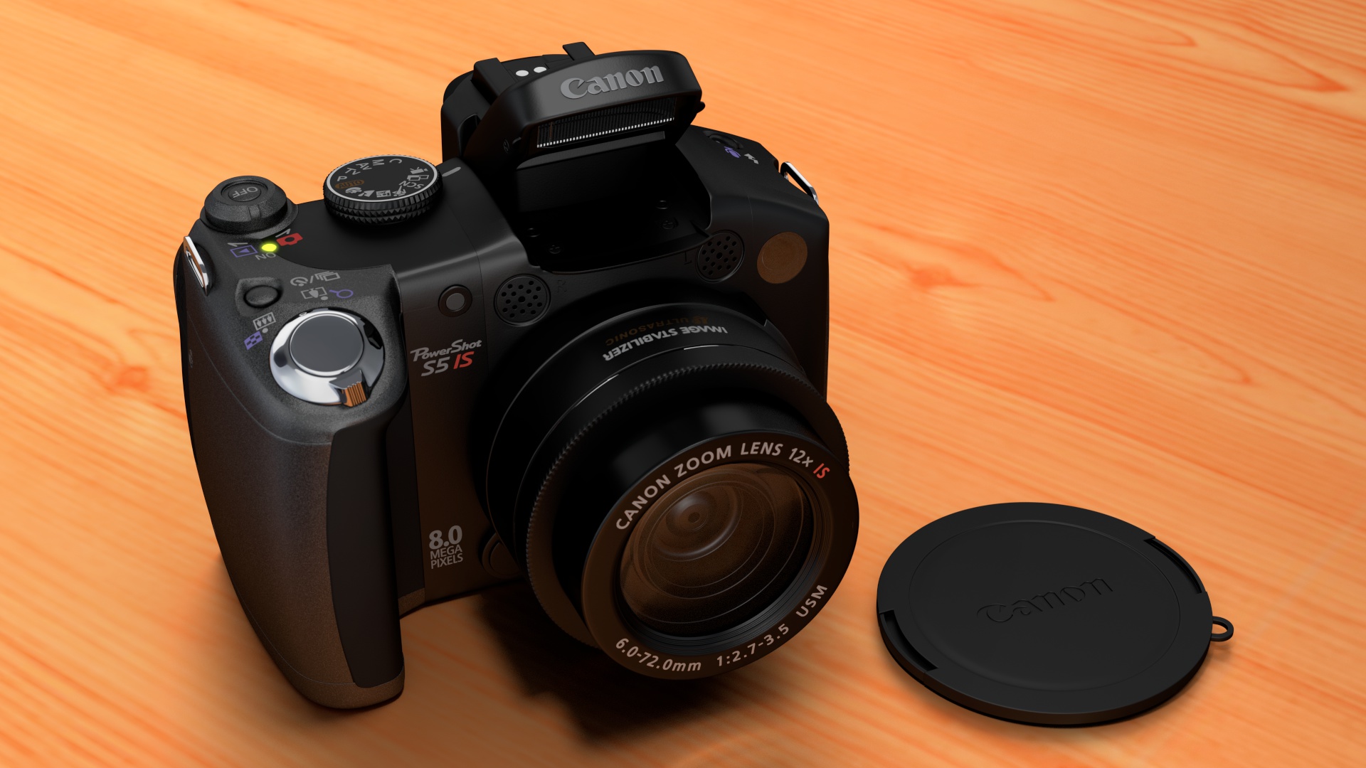 Bueno, después de un tiempo de seguir toqueteando los materiales, creo que daré esta por terminada, lo cual no quita qué más adelante se me dé por seguir trasteando con el render y la iluminación (que nunca se me da tan bien como quisiera) o hacer alguna otra escena. Es mi vieja, buena y cumplidora cámara, la Canon PowerShot S5 IS, echa en Blender. El render es de Cycles a 1.000 ciclos.