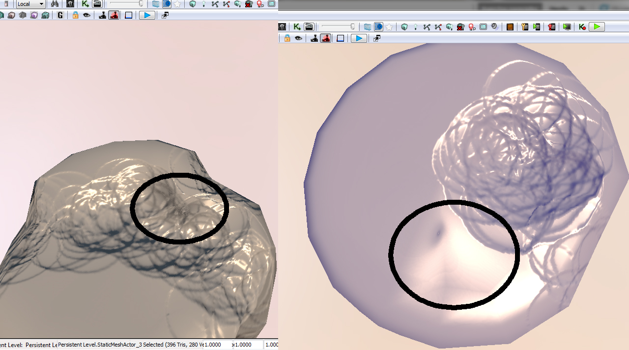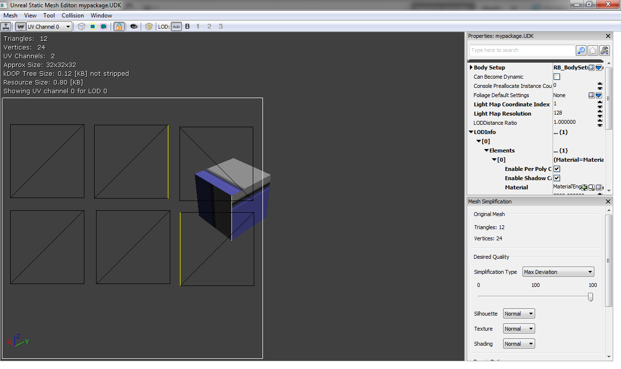 Mi pregunta es: ¿es posible evitar esto y que se sombre bien? Hice una prueba en 3DMax, bakeando un lightmap allí, y pude ver que cuando se usan resoluciones muy pequeñas ocurre lo mismo, sin embargo, con resoluciones más altas no ocurre. En UDK en cambio si me ocurre con resoluciones altas también. Como mejor he podido comprobar que se muestra es cuando cálculo la iluminación sobre los vertex.