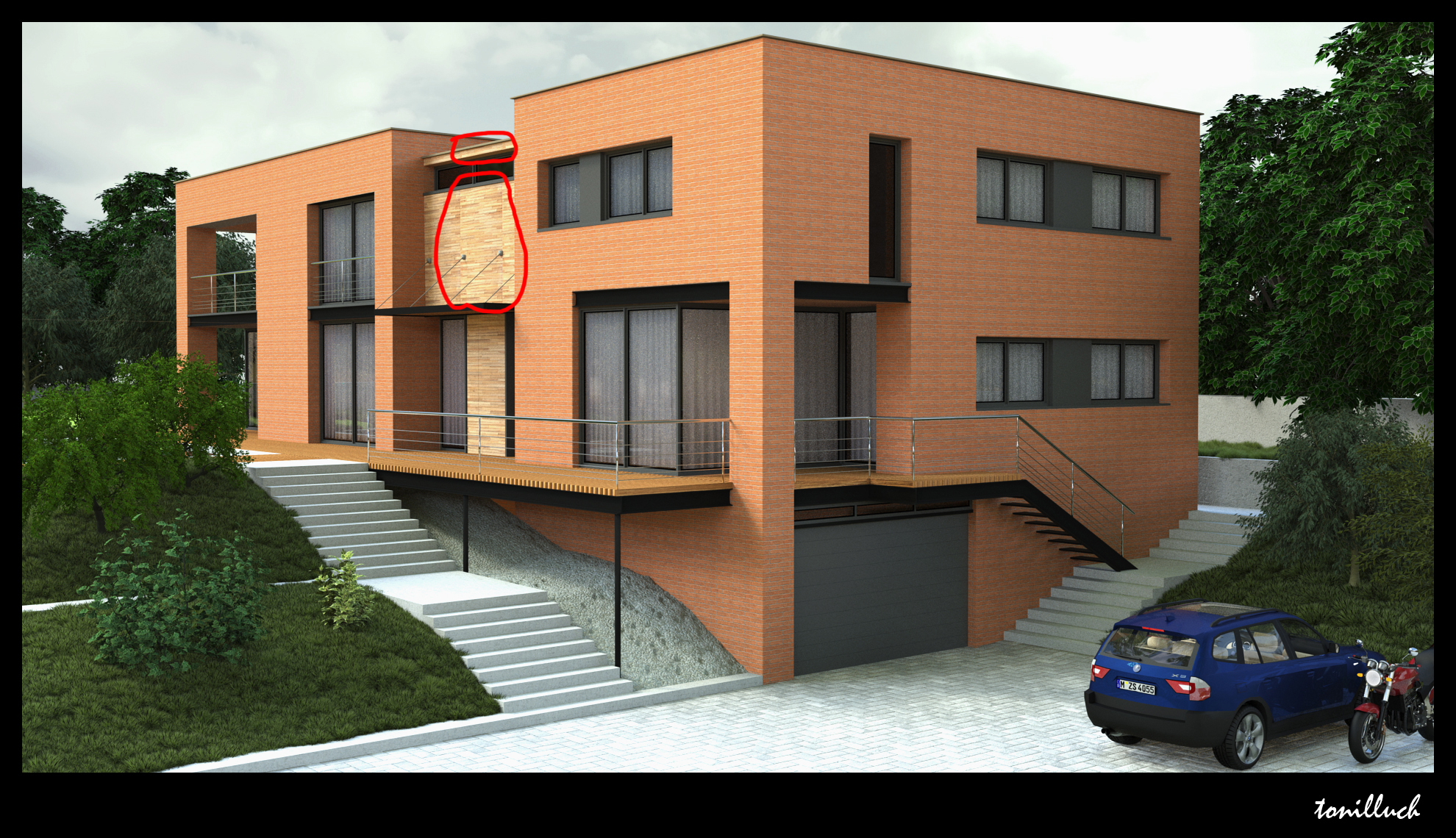 Ah otra cosa ya que es modelado arquitectónico no le vendría mal que le pusieras la escala humana alguien bajando las escaleras o bajando del carro no quedaría nada mal.