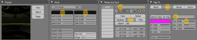 Después de eso ve a los botones Shading/world (f y ajústalo a sphere mapeando sobre el panel textures and input. Sobre el panel map todo presiona hori y ajusta el modo blending para agregar. Ajusta el color del mundo en oscuro y con el deslizador col puedes ajustar la intensidad del mapa HDRI. Figura 5.