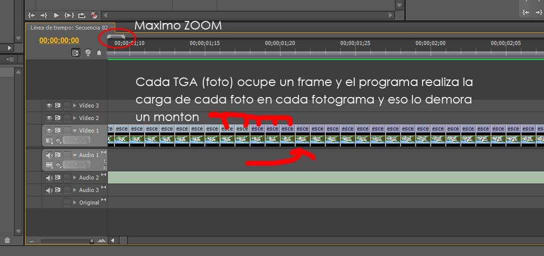 Hola qué tal, como están todos, estoy haciendo un video 3D y he renderizado 4900 fotografías en TGA en el 3DS Max, después de 9 días de renderizado tengo las 4900 fotografías enumeradas, las exporte al Premiere para hacer el video, cada frame del Premiere es una fotografía, pero el problema ahora es que el Premiere muestra una fotito chiquita en la línea de tiempo y eso hace que se demore uf un montón cada vez que quiero editar, pues quiero poner sonido, otras fotografías que aparezcan en el video, pero cuando se activa el autograbado se demora demasiado en estar apto para seguir editando, y si se me ocurre cambiar de ventana, por ejemplo, revisar el Internet pues lo hago para ver algún tutorial que me ayude con algún problema, cuando regreso al Premiere de nuevo el programa se queda pensando un rataso, y la verdad no sé porque ocurre esto, yo creo que es porque el Premiere carga cada fotito en su línea de tiempo y es ahí donde demora, pero no estoy seguro que ese sea el problema, pego un pantallazo para ver si se entiende mejor lo que quiero expresar.