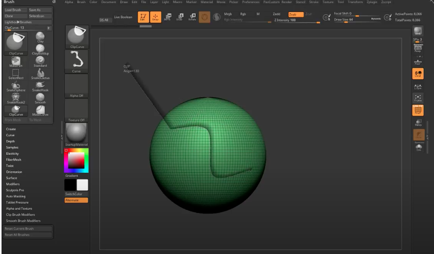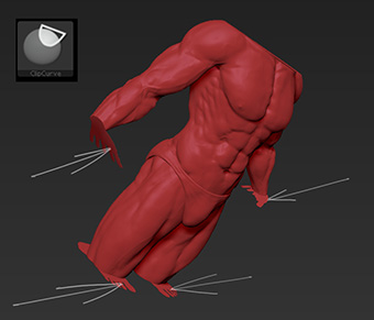 Las clip curves funcionan bien usando DynaMesh. Yo primero compactaría las formas a cortar con move y pinch, ya habiendo convertido el modelo a DynaMesh. Y después aplanas con clip curves, haces un nuevo DynaMesh (Ctrl + arrastrar el ratón en el fondo) y la geometría compactada desaparece.