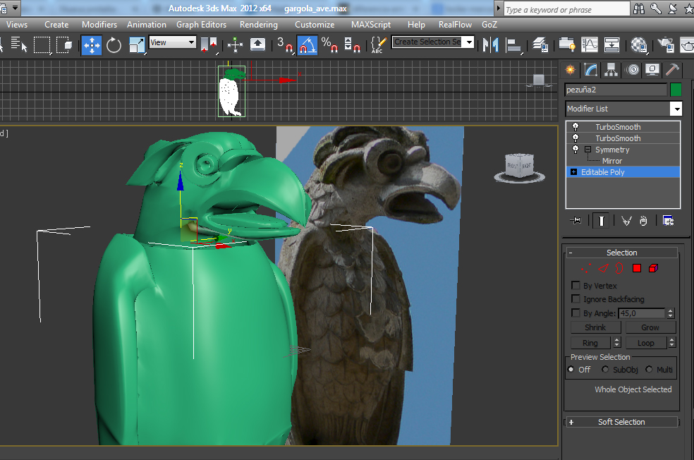 Hola, sigo con el modelado para impresión 3d (fresado CMN) esta vez estoy modelando una estatua y tengo un problema, normalmente haría esto con un bump, pero en este caso por ser para impresión no valen los medios para qué en el render se vea cómo se quiere así que ¿habrá alguna forma de hacer esto? Se trata de la textura de plumas de el ave, necesito una forma de hacerlo más rápida qué modelar pluma por pluma en el 3D Max, no eh podido aún usar el Z Brush pues sigo con mi problema de que se ve muy pixelado que nunca pude corregir así que, necesitare hacerlo en 3D Max, hace tiempo vi que alguien lo hacía también con un map de desplazamiento e incluso en la viewport alteraba la malla no solo en el render, pero no sé si algo así será posible, ni menos cómo hacerlo, espero me puedan aconsejar. Gracias.