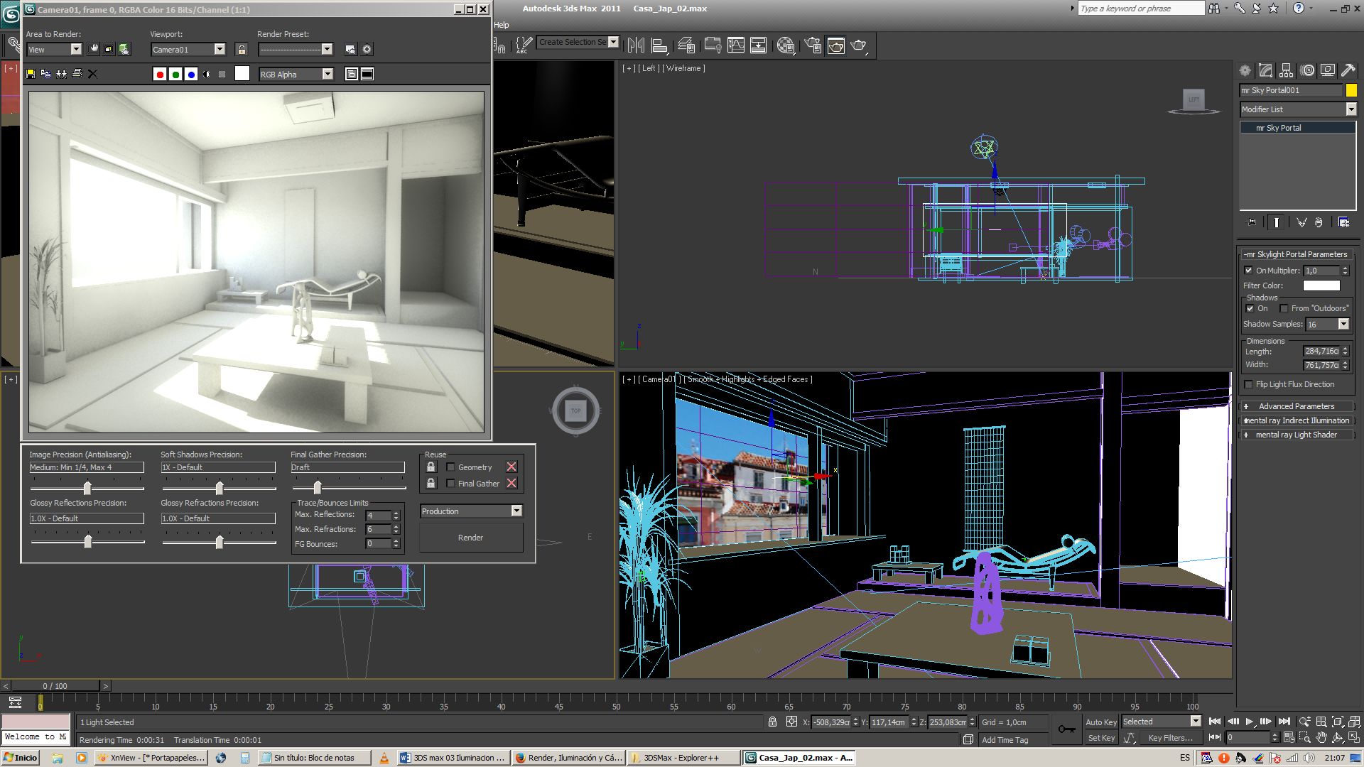 Intento seguir un tutorial para iluminar un interior con luz natural. He puesto un Daylight System con mrSun, mrSky y mrSkyPortal en la ventana.