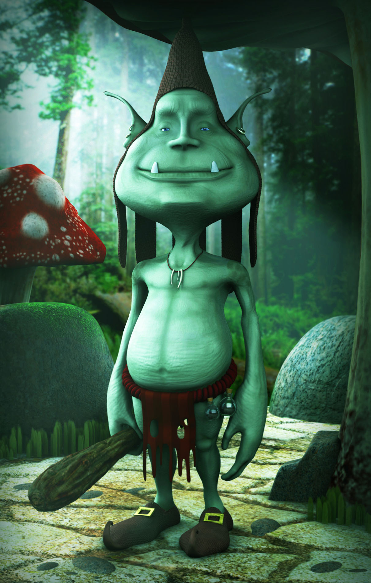 Está muy gracioso el personaje. Yo le intentaría marcar más las formas del ombligo y las tetas, ya que son formas que parecen quedar un poco difusas, y creo que le darían más personalidad al personaje. También la zona de unión de la roca qué queda atrás a la derecha con el suelo queda cortada un poco artificial, ya que parece que el suelo es de baldosas o piedras, pero la roca parece clavarse en este. Si pones esa parte de suelo de tierra, o algo de hierba qué tape la unión quedará más natural. A la hierba también le daría más variación, ya qué así todo recta hacia arriba queda un poco raro. Espero que te ayude mi opinon, pero en general está muy bien. Saludos.