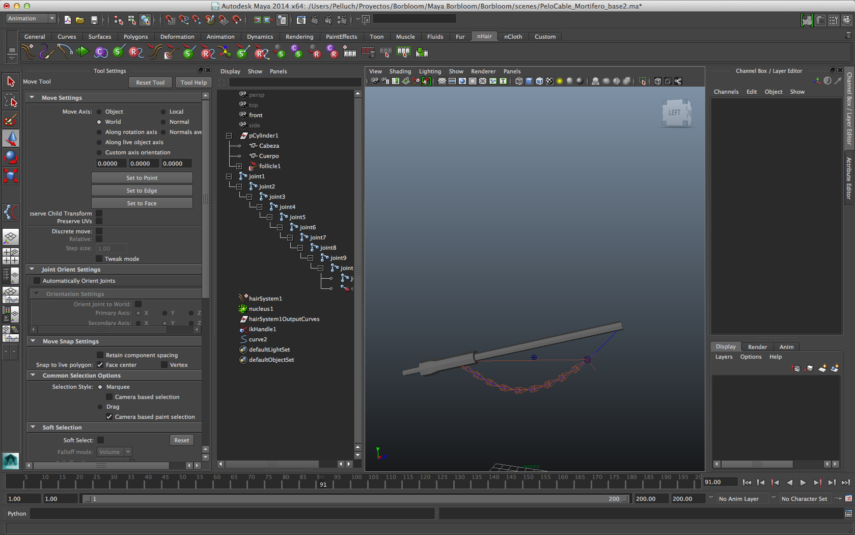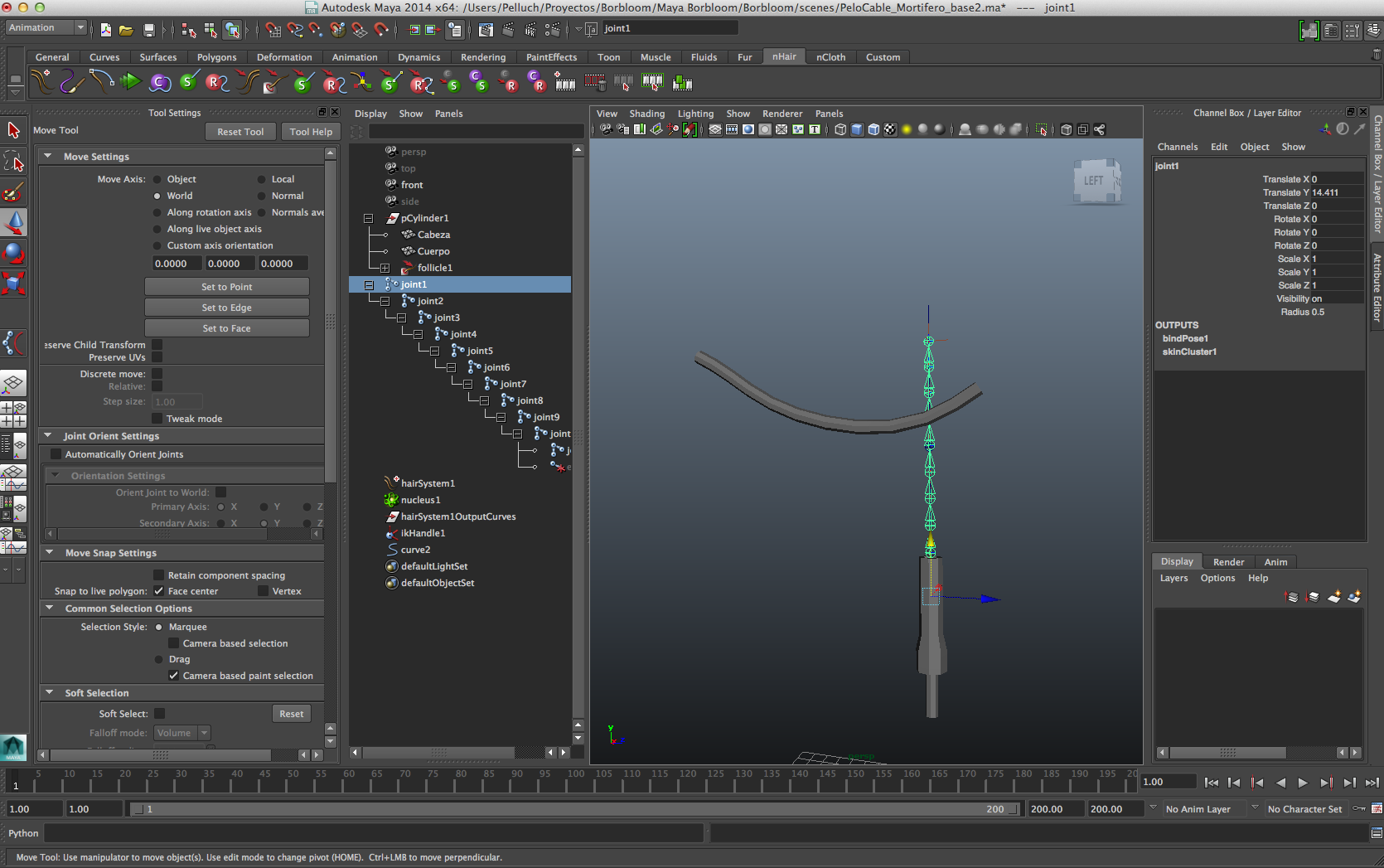 He visto que una forma interesante de hacerlo es creandole al cuerpo una cadena de joints que lleve encima una curva. Convirtiendo esa curva en dinámica con nHair y, a su vez, en la curva de una IK Spline logro que deforme dinamicamente. Ahora, no sé cómo hacer para qué el cuerpo se comporte exactamente cómo se comporta el pelo-curva, cómo agrupar todo para conseguir la animación que yo quiero (a veces el cuerpo se me va por un lado, aunque la curva permanezca pegada a la cabeza), cómo lograr que la cabeza se mantenga rígida y colisione, si es necesario, con el cuerpo del cable.
