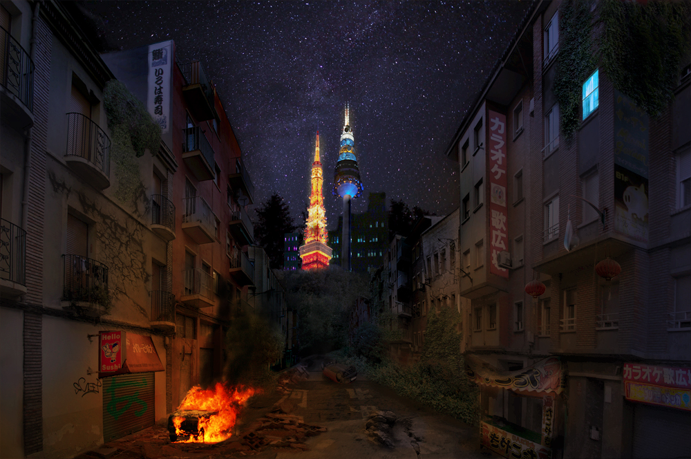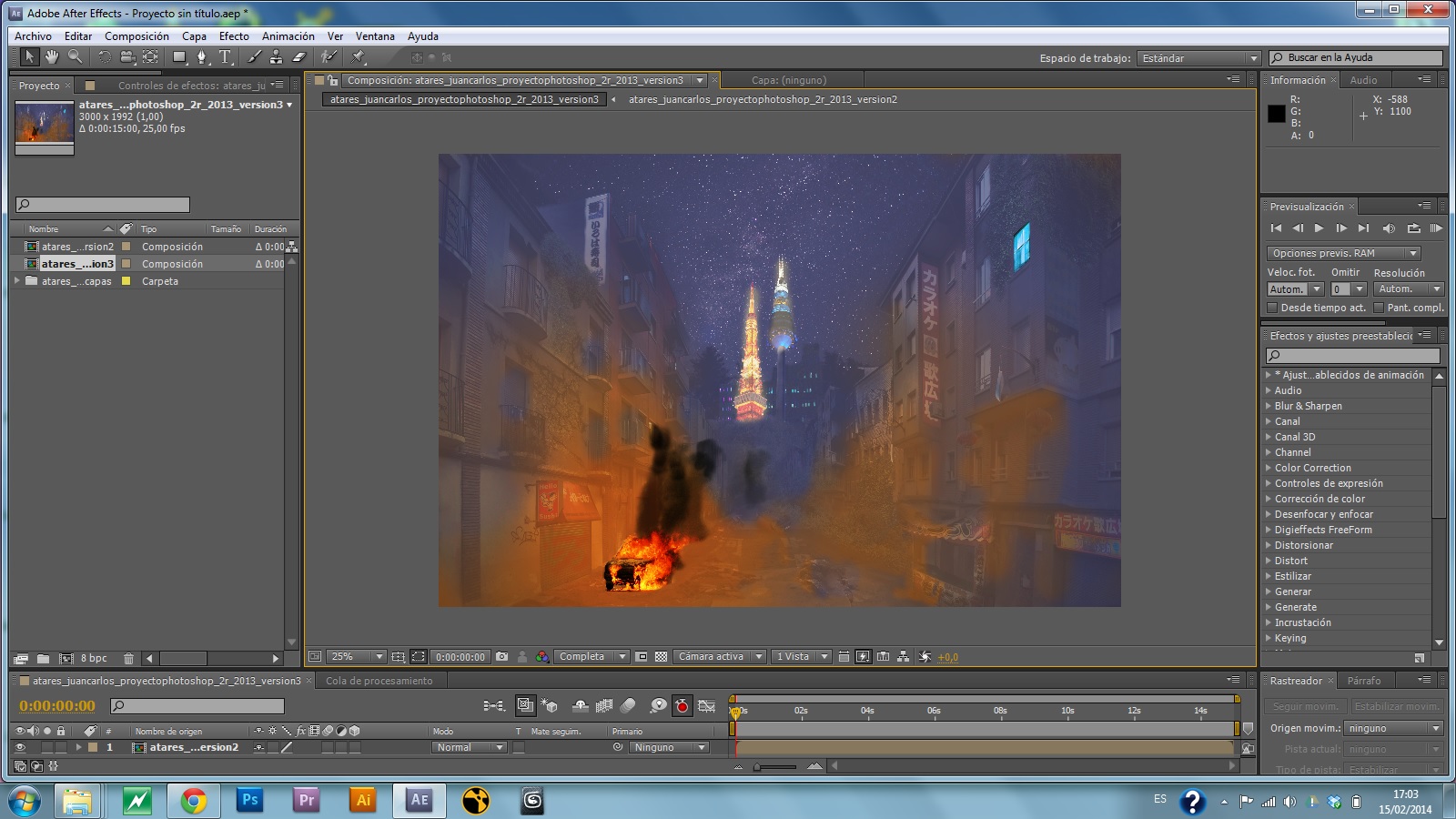 Quiero hacer un breakdown de mi trabajo de montaje de Photoshop para mostrar de manera dinámica todas sus capas de etalonaje y sus elementos, en total son 60. La cosa es que cuando importo el archivo de Photoshop en After Effects la apariencia del trabajo cambia totalmente (tal y como os muestro a continuación). ¿Por qué me ocurre esto? ¿Hay alguna posibilidad de arreglarlo? Sé que no es una maravilla de trabajo, pero lo hice hace un tiempo para clase y me hace ilusión.