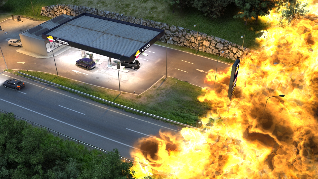 Como de FX no tengo mucha idea, me quedo flipando en colores cuando hacéis estas cosas, no tengo ni idea de destruir, suelo construir. Miedo da la onda de fuego y destrucción, está genial, sobre todo cómo se va destruyendo elementos, ¿aquí lo hiciste con algún plugin tipo rayfire, o el mismo Afterburn lo simula?