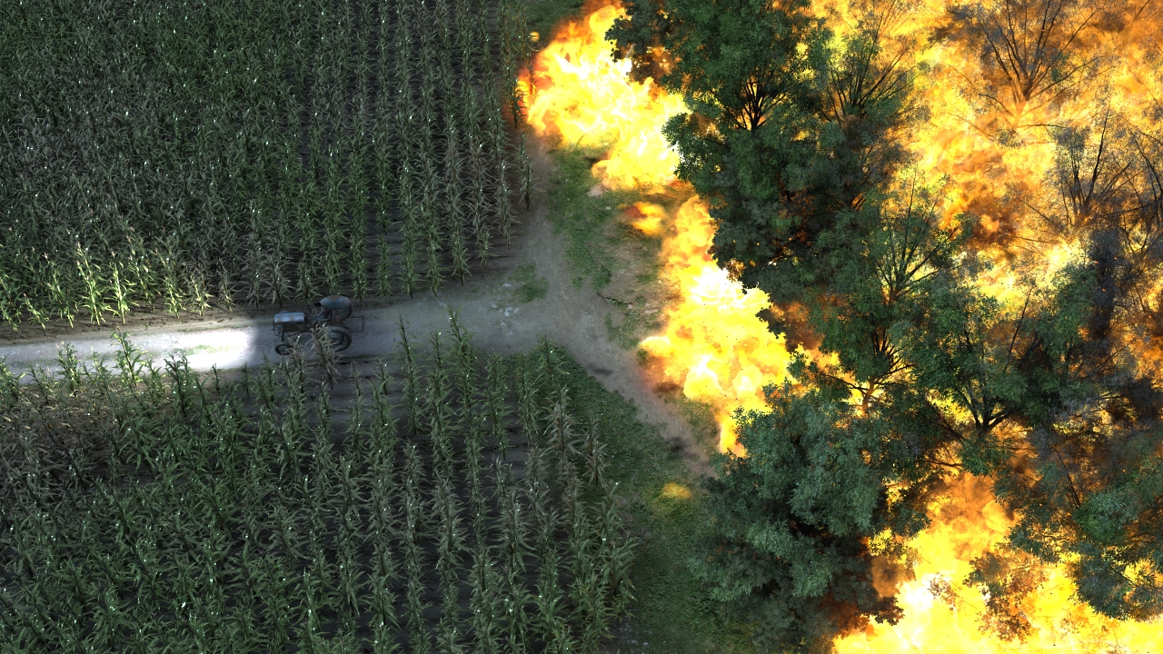 Que buen trabajo con el del fuego, aunque podría mencionar que el Fuego Naturalmente es una fuente lumínica y debe iluminar bastante y más con a escala de la tormenta, se ve mejor en la segunda imagen donde se ve el carro escapando, donde la tormenta de Fuego creo que iluminaría más que las luces del carro, saludos.