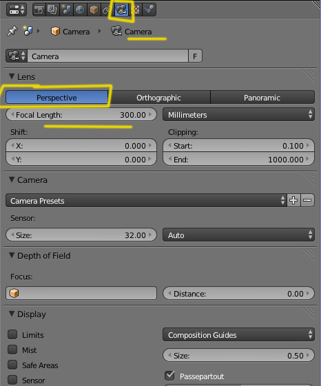 Pero luego si seleccione la cámara y abres el Object Data de la cámara puedes cambiar la FOCAL y jugar con la distancia y ese enfoque para conseguir diferentes enfoques. Así como la opción Ortographic.